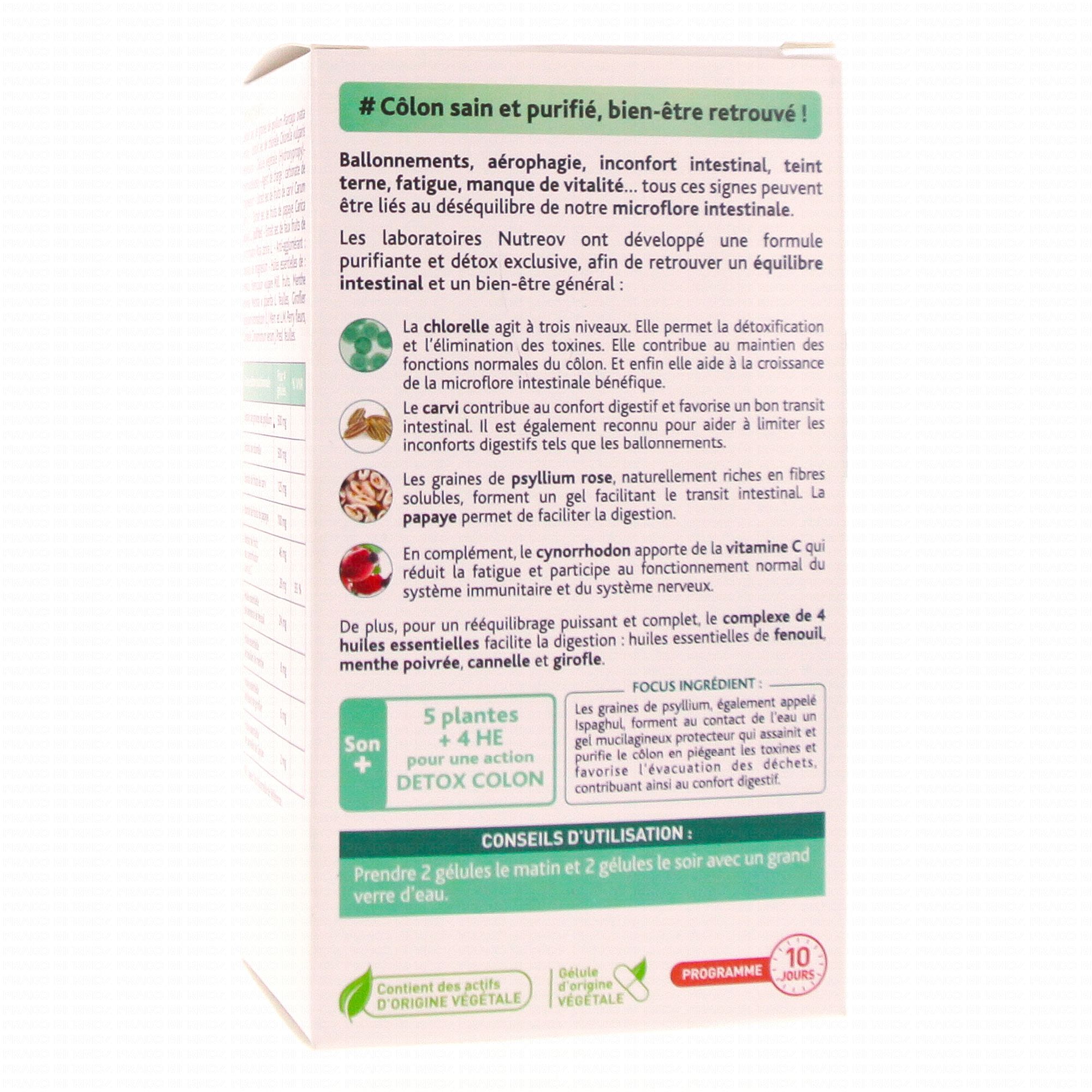 Extrait sec de graines de psyllium (Plantago ovata Forssk), Extrait sec de chlorelle (Chlorella vulgaris Beijerinck), Gélule végétale : Hydroxypropylméthylcellulose, Agent de charge : Carbonate de magnésium, Extrait sec de fruits de carvi (Carum carvi L.), Extrait sec de fruits de papaye (Carica papaya L.) (Sulfites), Extrait sec de faux fruits de cynorrhodon (Rosa canina L.), Anti-agglomérant : Stéarate de magnésium, Huiles essentielles de : Fenouil (Foeniculum vulgare Mill. fruits), Menthe poivrée (Mentha x piperita feuilles), Giroflier (Syzygium aromaticum (L.) Merr. et L.M. Perry fleurs), Cannelle (Cinnamomum verum j. Presl. feuilles).
