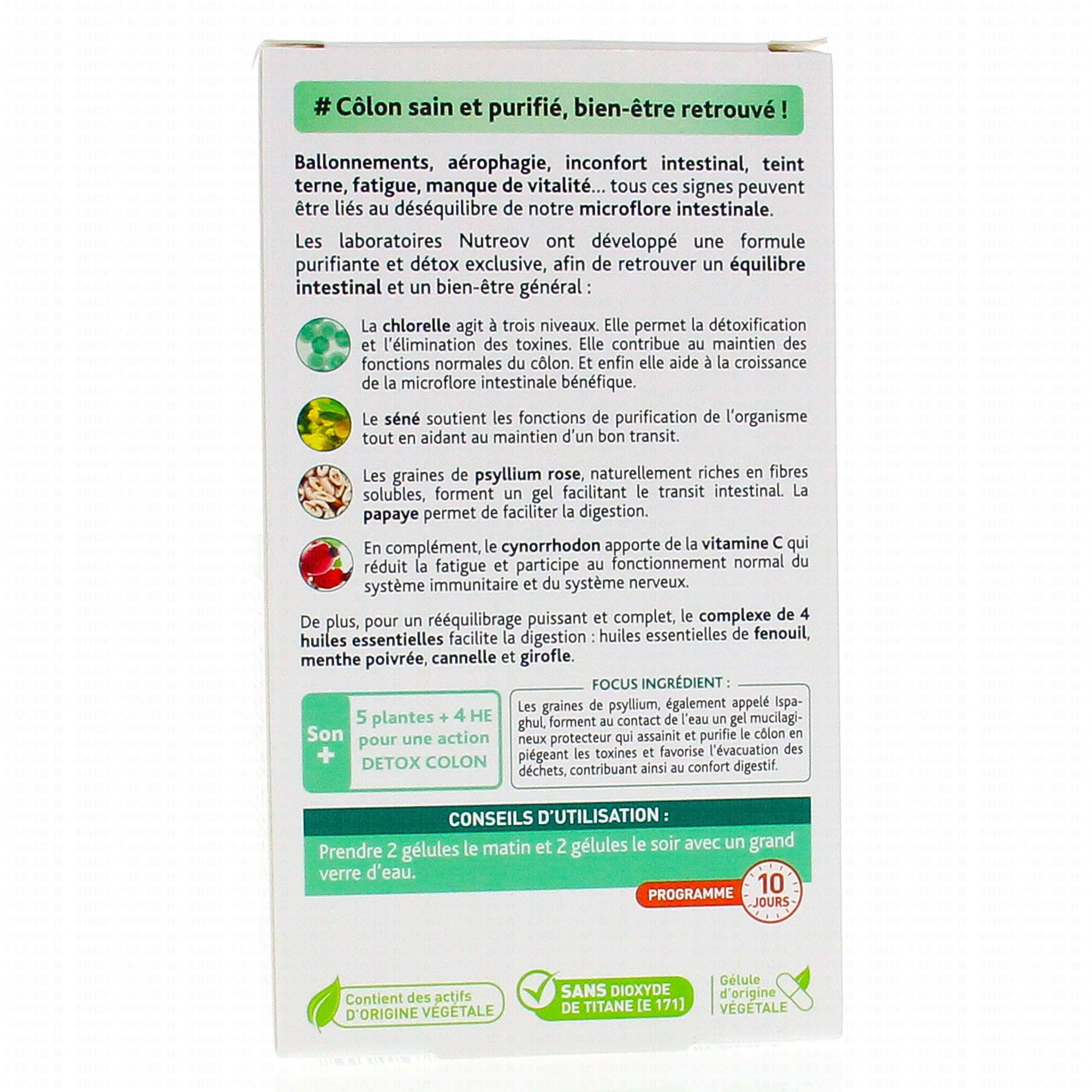 Extrait sec de graines de psyllium (Plantago ovata Forssk), Extrait sec de chlorelle (Chlorella vulgaris Beijerinck), Gélule végétale : Hydroxypropylméthylcellulose, Agent de charge : Carbonate de magnésium, Extrait sec de fruits de carvi (Carum carvi L.), Extrait sec de fruits de papaye (Carica papaya L.) (Sulfites), Extrait sec de faux fruits de cynorrhodon (Rosa canina L.), Anti-agglomérant : Stéarate de magnésium, Huiles essentielles de : Fenouil (Foeniculum vulgare Mill. fruits), Menthe poivrée (Mentha x piperita feuilles), Giroflier (Syzygium aromaticum (L.) Merr. et L.M. Perry fleurs), Cannelle (Cinnamomum verum j. Presl. feuilles).