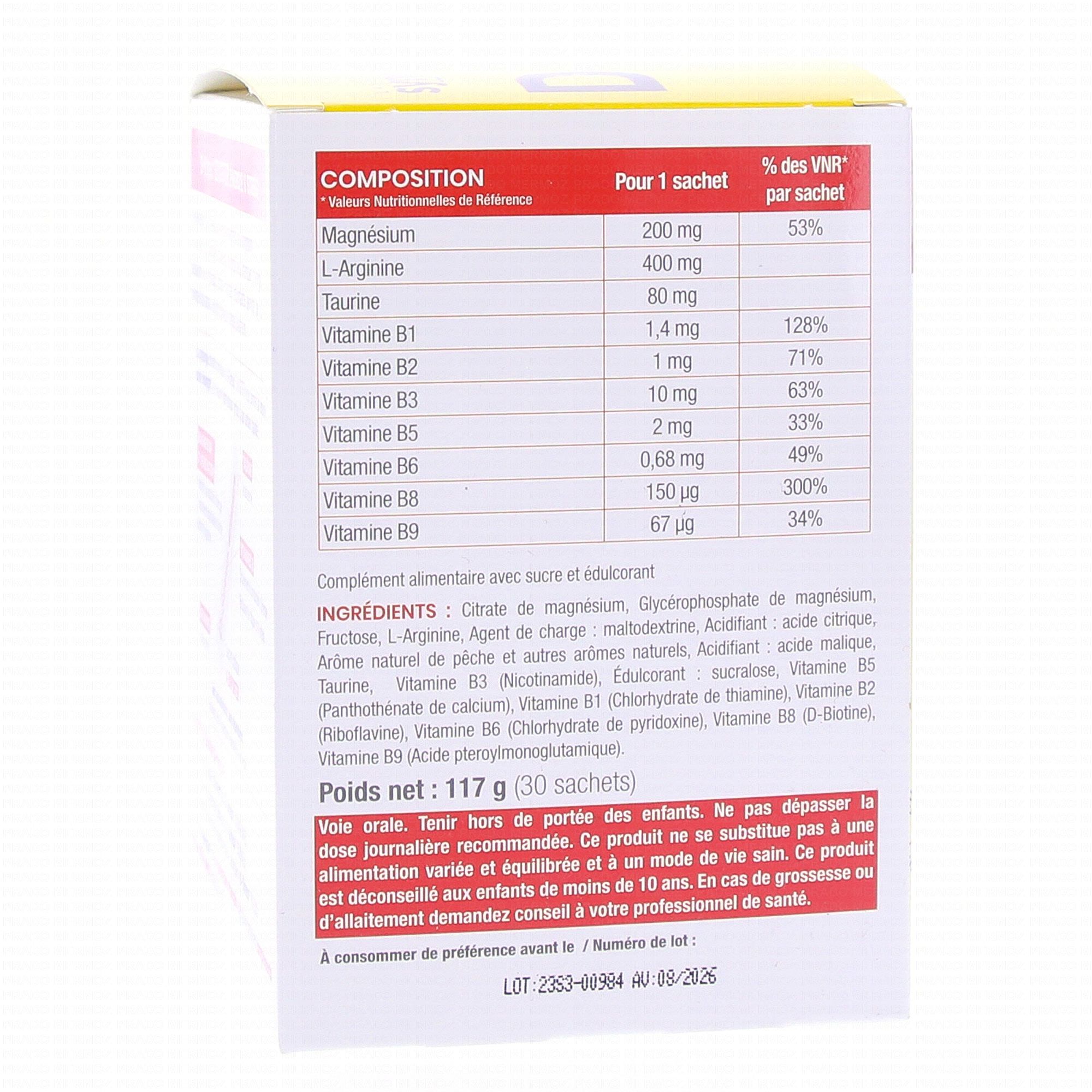 Citrate de magnésium, Glycérophosphate de magnésium, Fructose, L-arginine, Agent de charge : Maltodextrine, Acidifiant : Acide citrique, Arôme naturel de pêche et autres arômes naturels, Acidifiant : Acide malique, Taurine, Vitamine B3 (Nicotinamide), Édulcorant : Sucralose, Vitamine B5 (Panthothénate de calcium), Vitamine B1 (Chlorhydrate de thiamine), Vitamine B2 (Riboflavine), Vitamine B6 (Chlorhydrate de pyridoxine), Vitamine B8 (D-Biotine), Vitamine B9 (Acide pteroylmonoglutamique).
