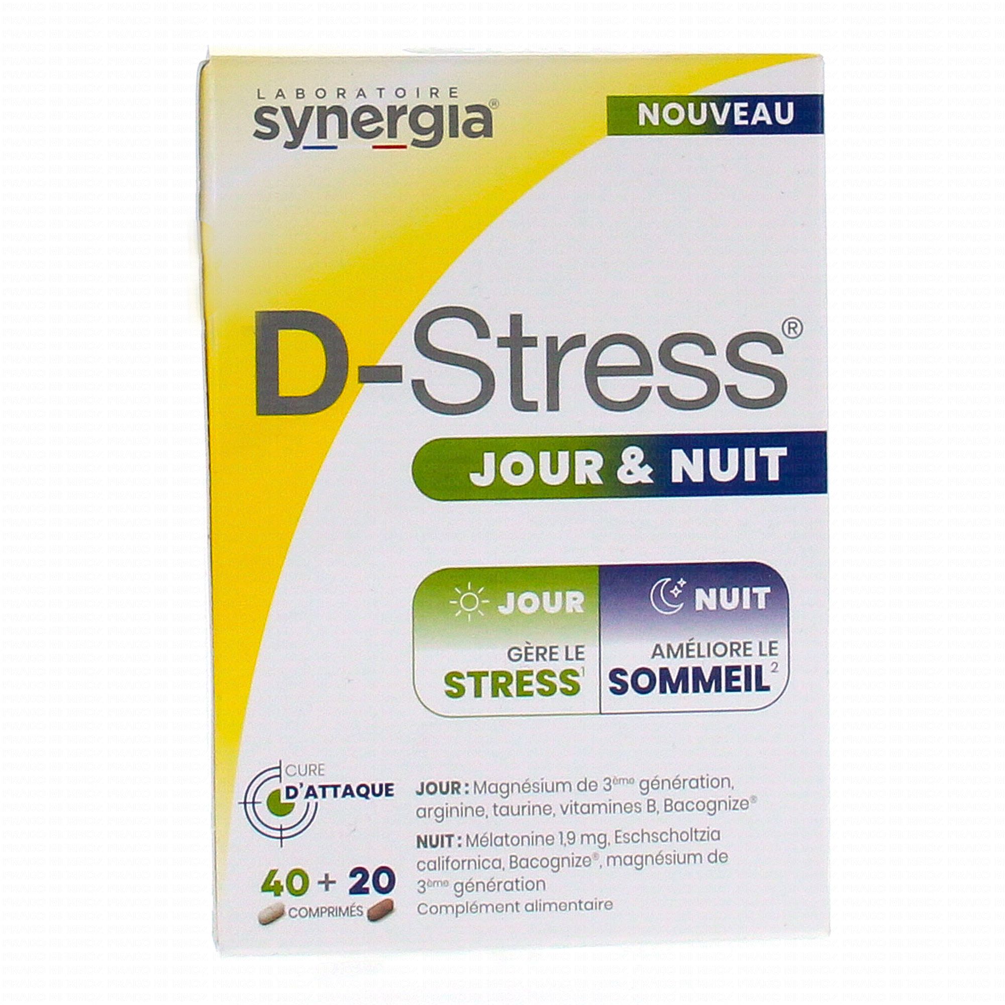 D-Stress Jour Nuit x60 capsules est un complément alimentaire qui contribue au fonctionnement normal du système nerveux grâce à la présence de Magnésium contenu dans les comprimés jours. Le Bacopa joue un rôle dans la relaxation. La taurine aide à la relaxation des muscles et du cœur. La mélatonine favorise l'endormissement dans le comprimé nuit et le pavot de Californie contribue au maintien d'un bon moral.