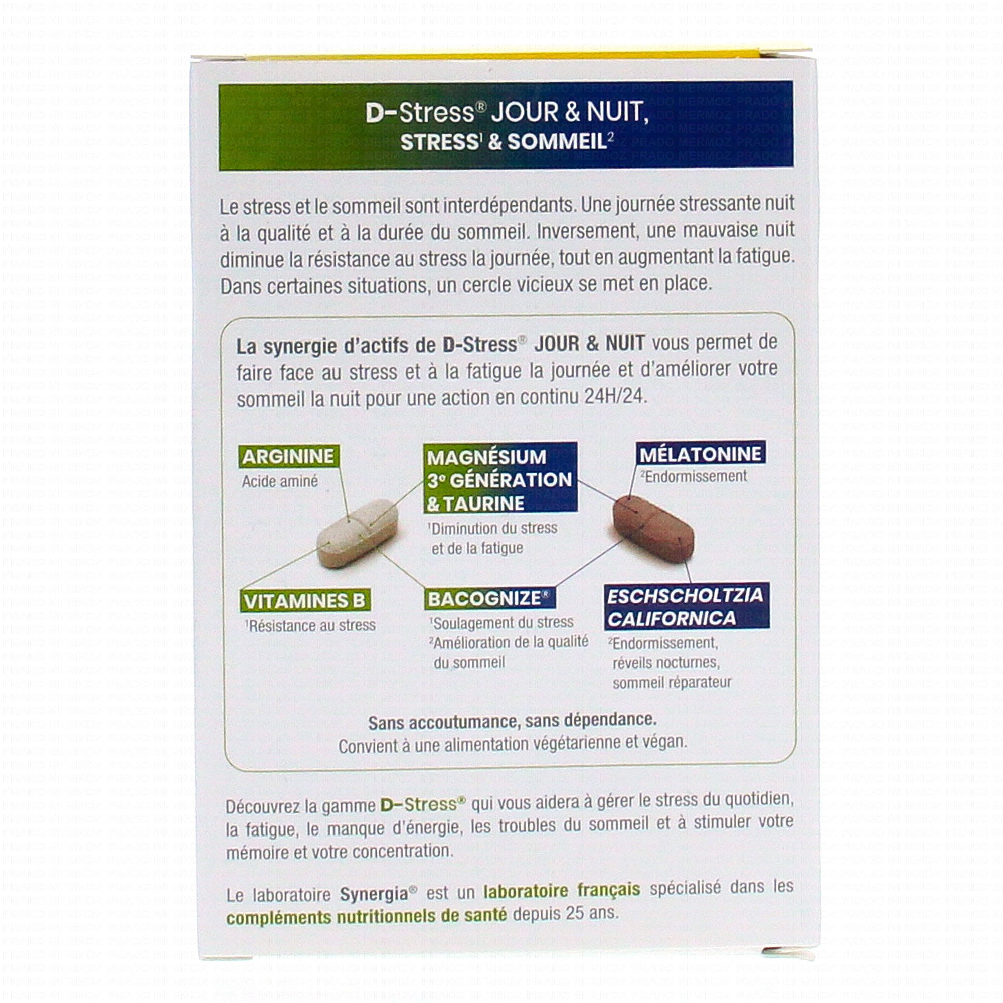 D-Stress Nuit : magnésium microencapsulé (magnésium, amidon de maïs, lécithine de tournesol), anti-agglomérant : phosphate tricalcique ; extrait sec d'eschscholzia californica (pavot de Californie), agent de charge : cellulose microcristalline ; colorant: jus de betterave rouge ; extrait sec de bacopa Bacognize (bacopa monnieri), taurine, anti-agglomérant : stéarate de magnésium ; mélatonine