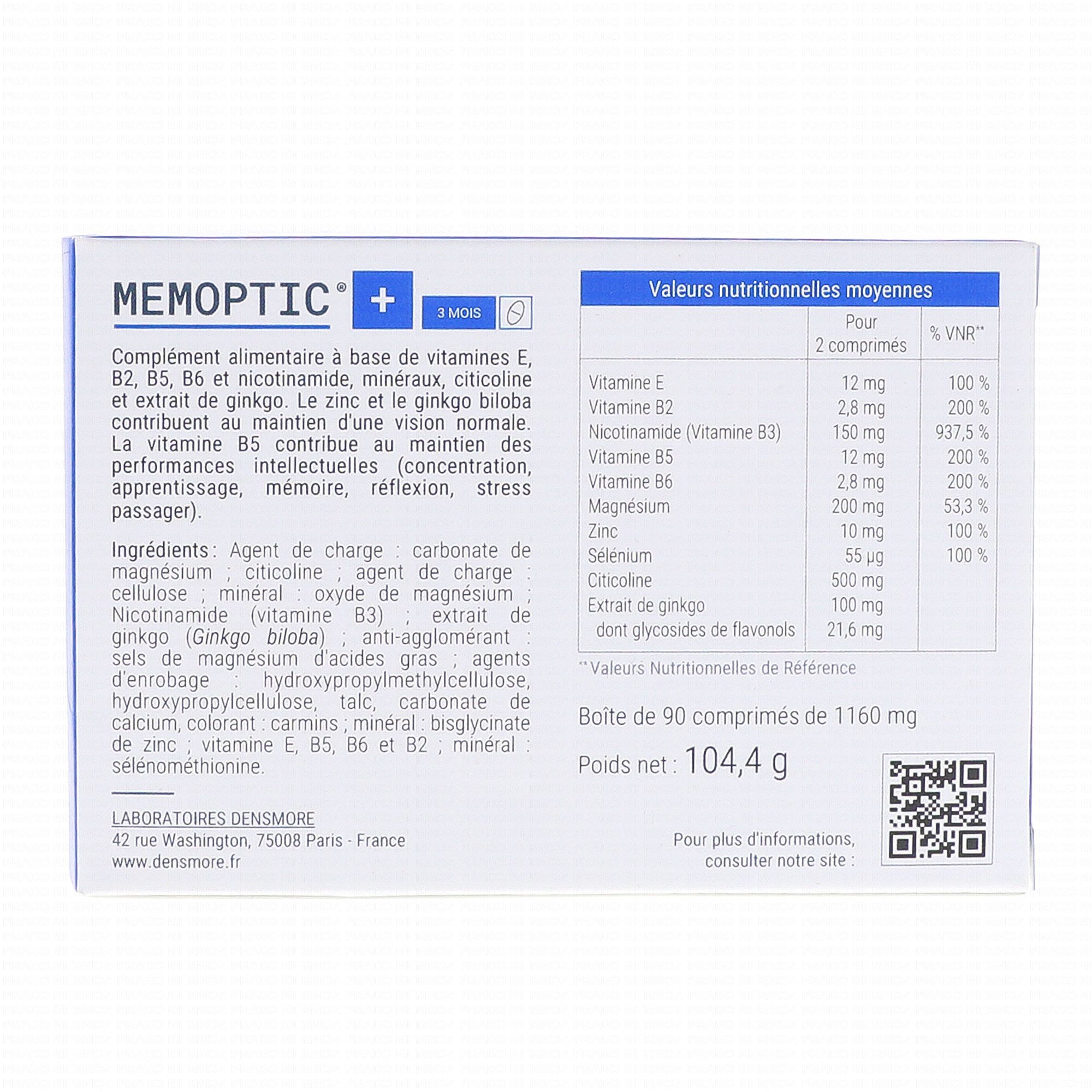 DENSMORE Memoptic est un complément alimentaire qui contribue au maintien d'une bonne audition et d'une bonne vision grâce à la présence de Gingko. Le Zinc aide également au maintien d'une bonne vision.