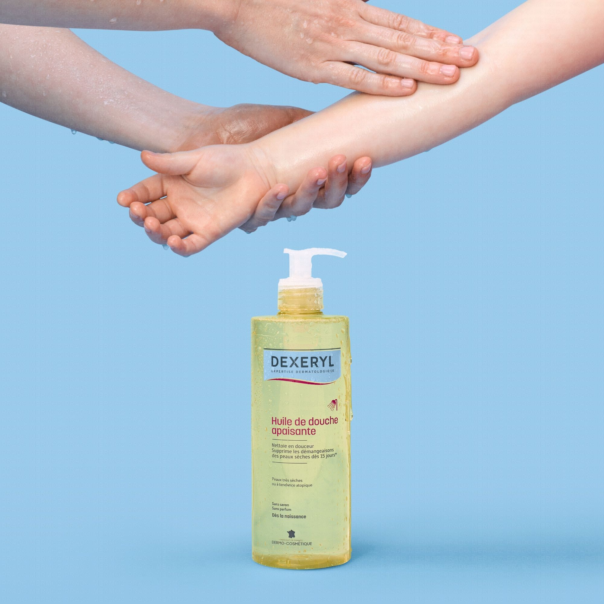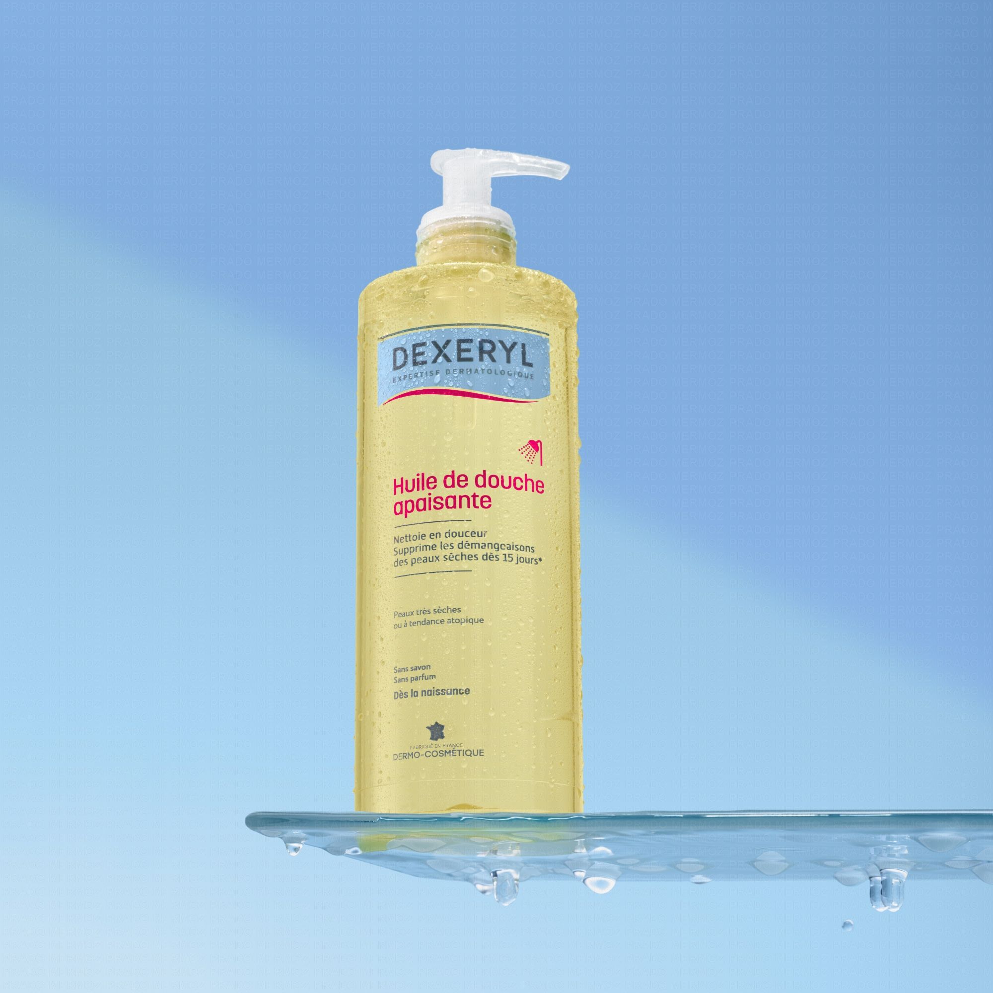 Un produit d'hygiène mal choisi peut accentuer un état de sécheresse cutanée. Il est recommandé d'éviter les savons parfois trop abrasifs, et de plutôt conseiller des textures nourrissantes comme les huiles, ayant une formule à base d'émollient, non irritante, hypoallergénique et sans parfum. Avec Dexeryl Essentiel Huile de douche apaisante, le soin des peaux très sèches commence dès la douche. Spécifiquement conçue pour les peaux très sèches ou à tendance atopique, l'huile de douche apaisante nettoie en douceur et relipide la peau, tout en préservant la barrière cutanée.