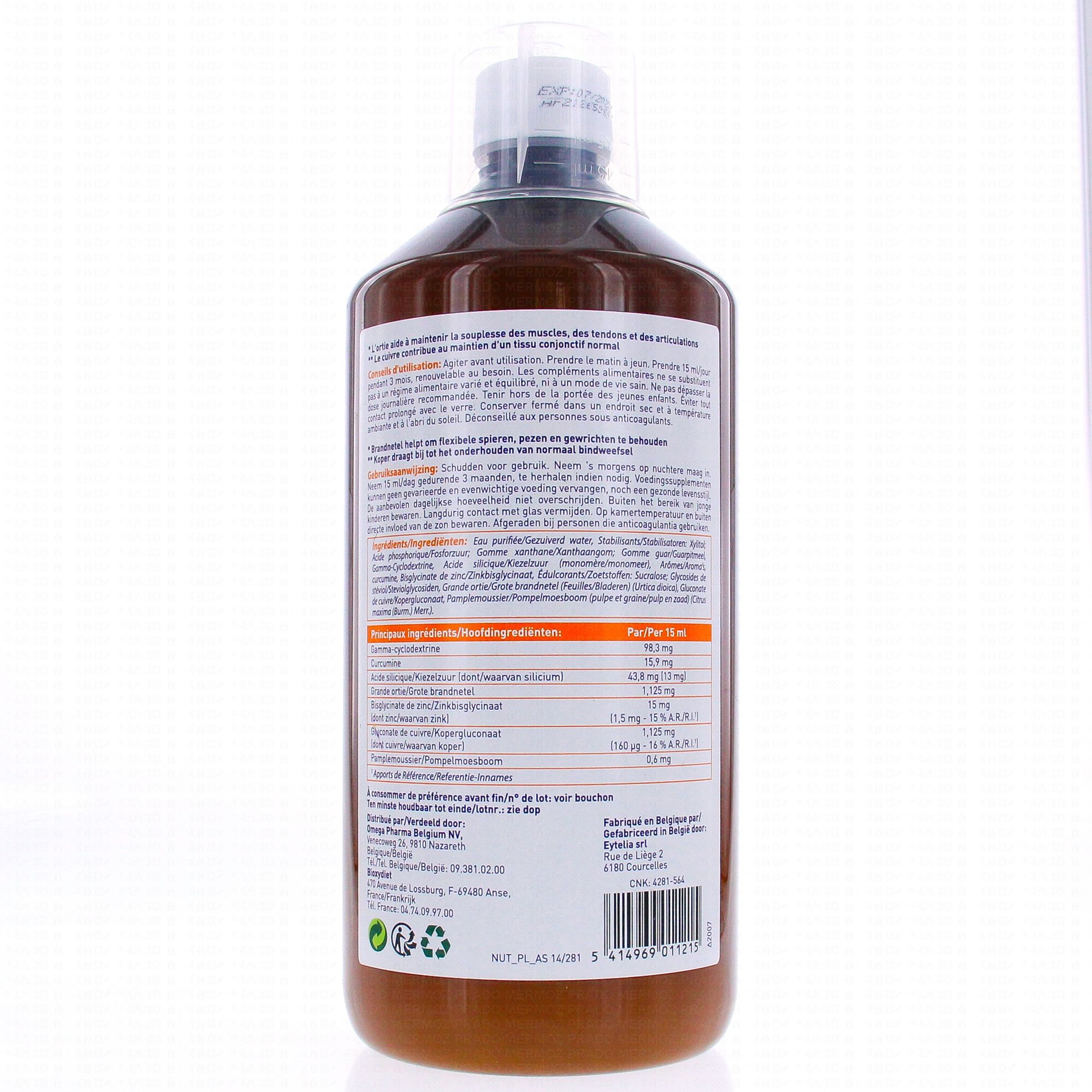Ingrédients : Eau purifiée, Stabilisants : Xylitol ; Acide phosphorique ; Gomme xanthane ; Gomme guar, Gamma-Cyclodextrine, Acide silicique (monomère), Arômes, curcumine, Bisglycinate de zinc, Édulcorants : Sucralose ; Glycosides de stéviols, Grande ortie (Feuilles) (Urtica dioica), Gluconate de cuivre, Pamplemoussier (pulpe et graine) (Citrus maxima (Burm.) Merr.).