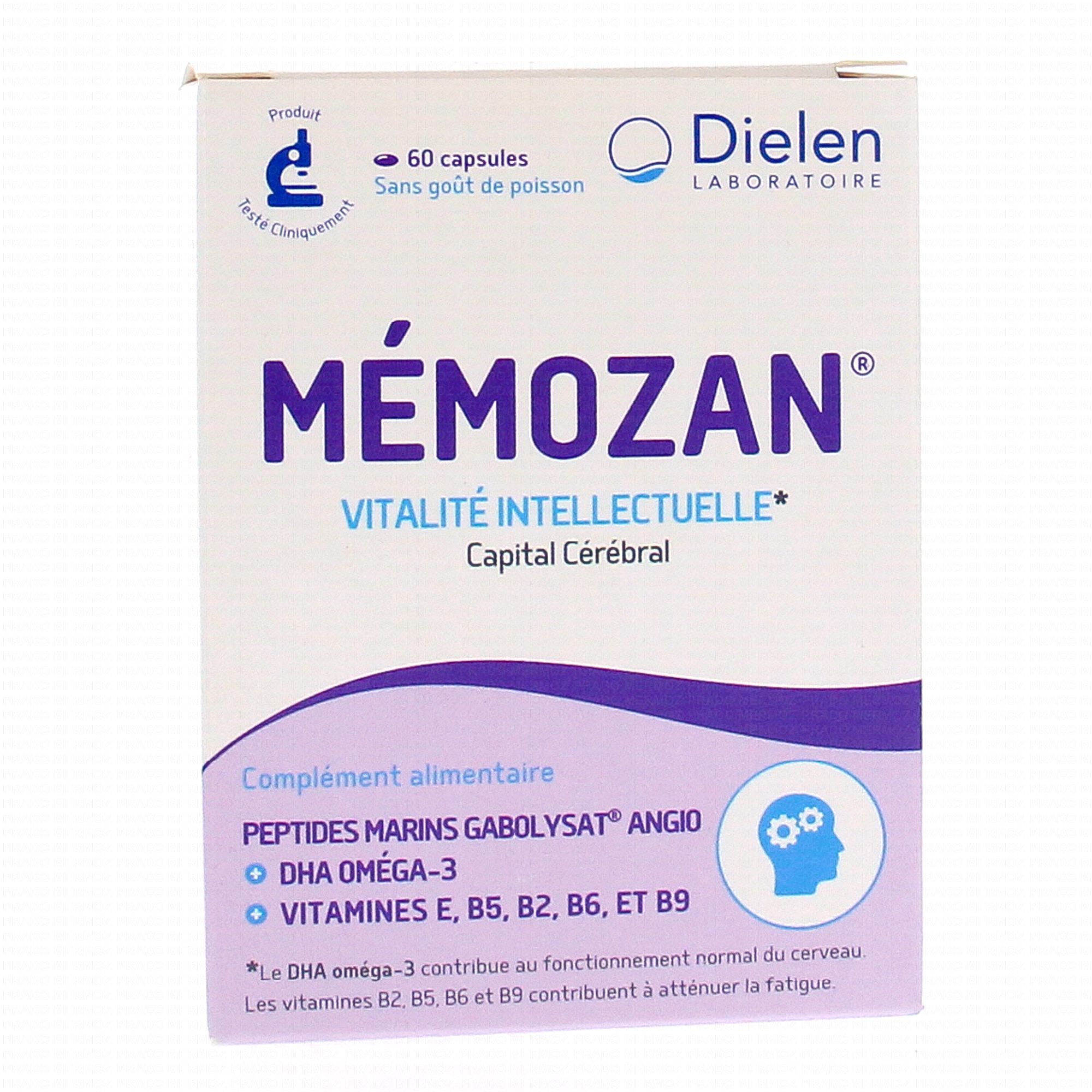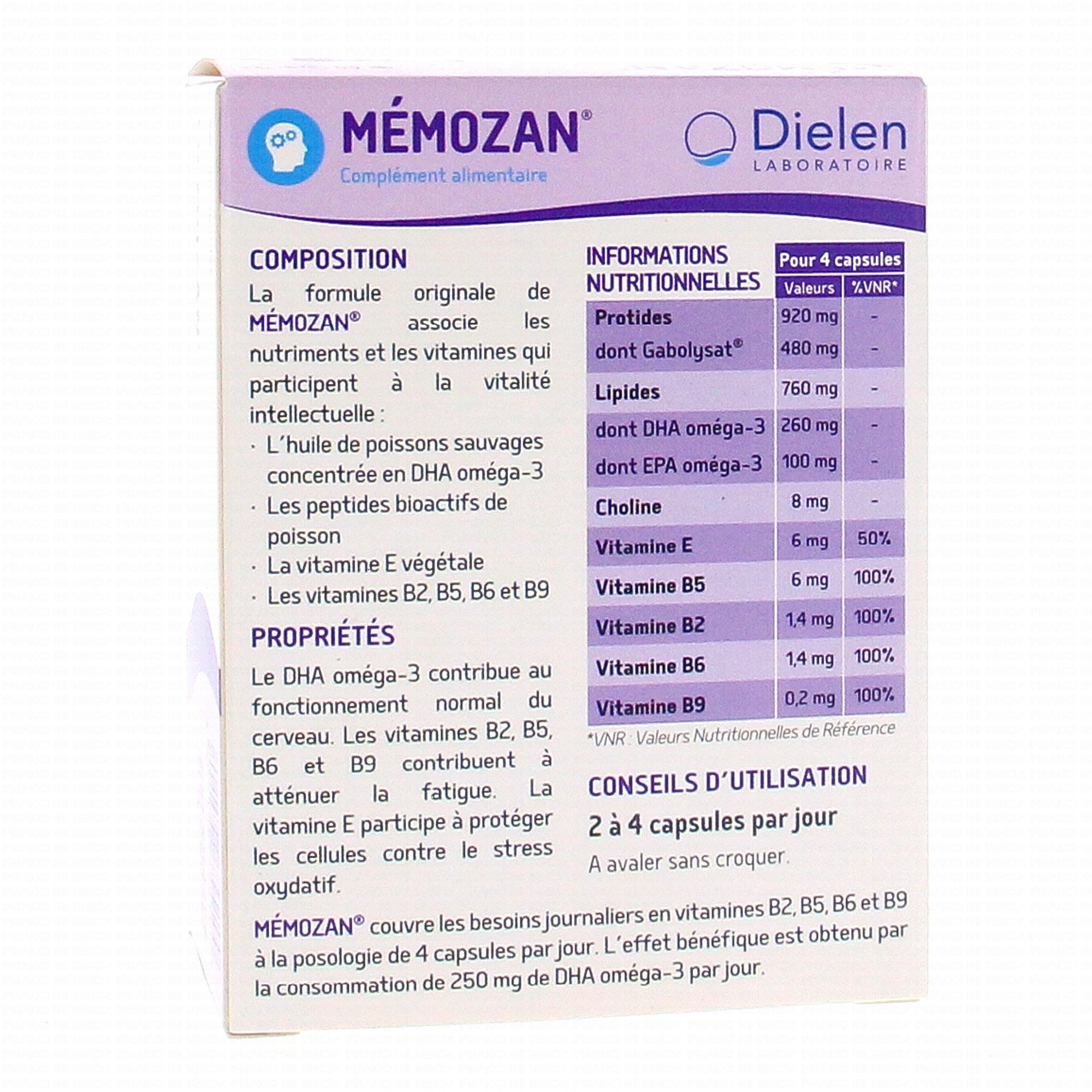 Recommandé en cas de fatigue intellectuelle ou d'activité cérébrale intense (études examens...), Memozan est enrichi en oméga-3 qui participe à un bon fonctionnement du cerveau, en vitamine B réduisant l'état de fatigue et en vitamine E protégeant le corps du stress oxydatif.