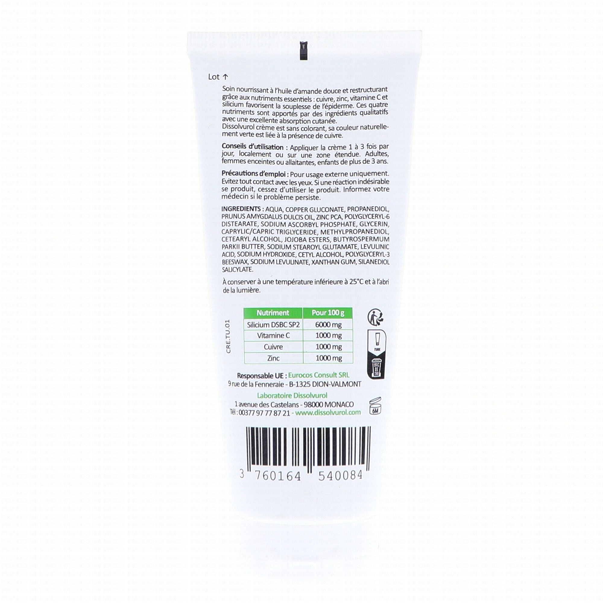 Ces quatre nutriments sont apportés par des ingrédients qualitatifs avec une excellente absorption cutanée. Dissolvurol crème est sans colorant, sa couleur naturellement verte est liée à la présence de cuivre.