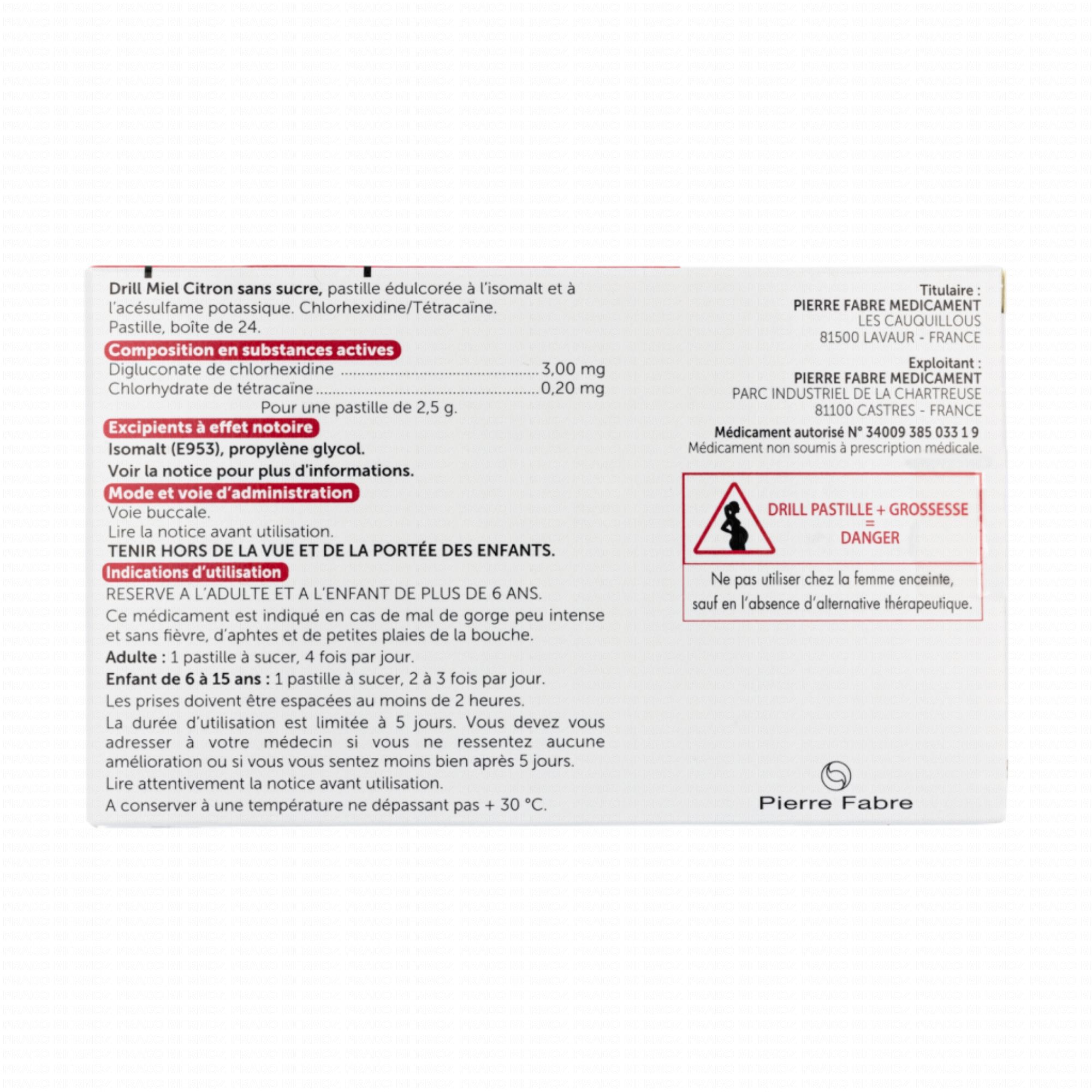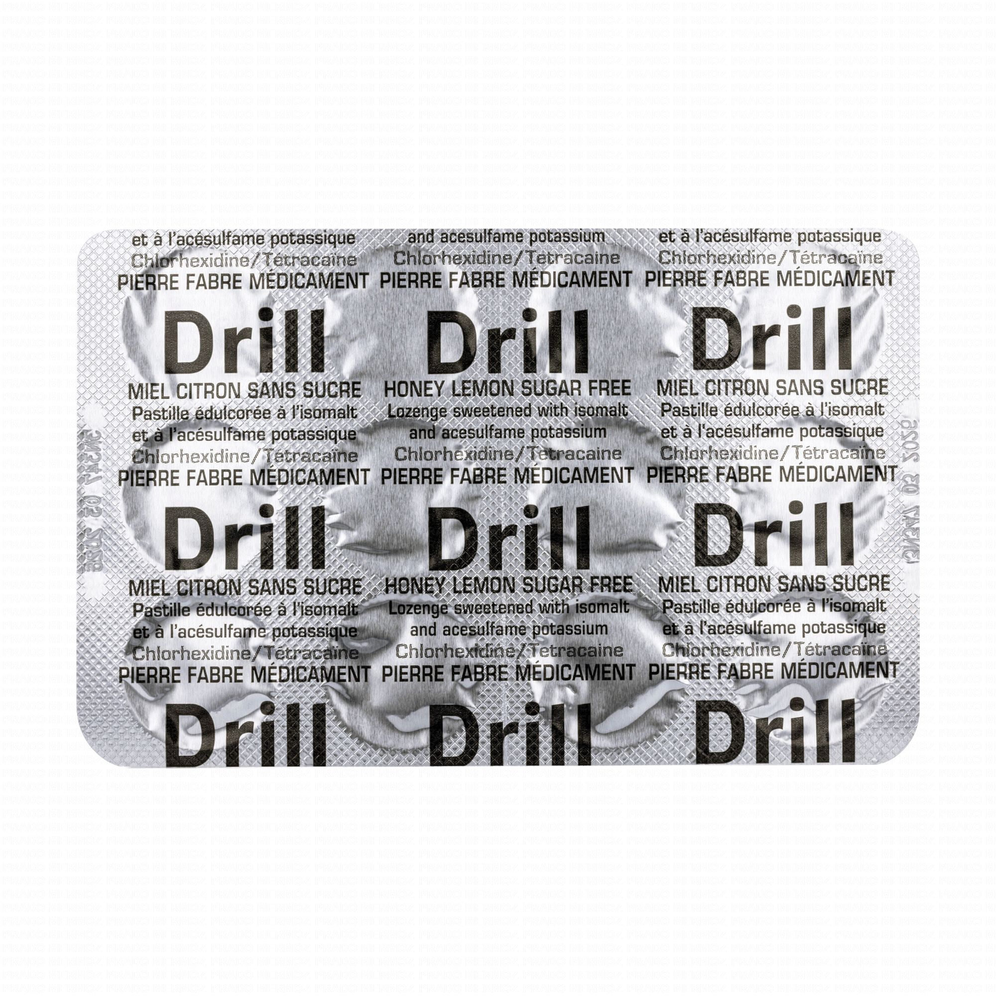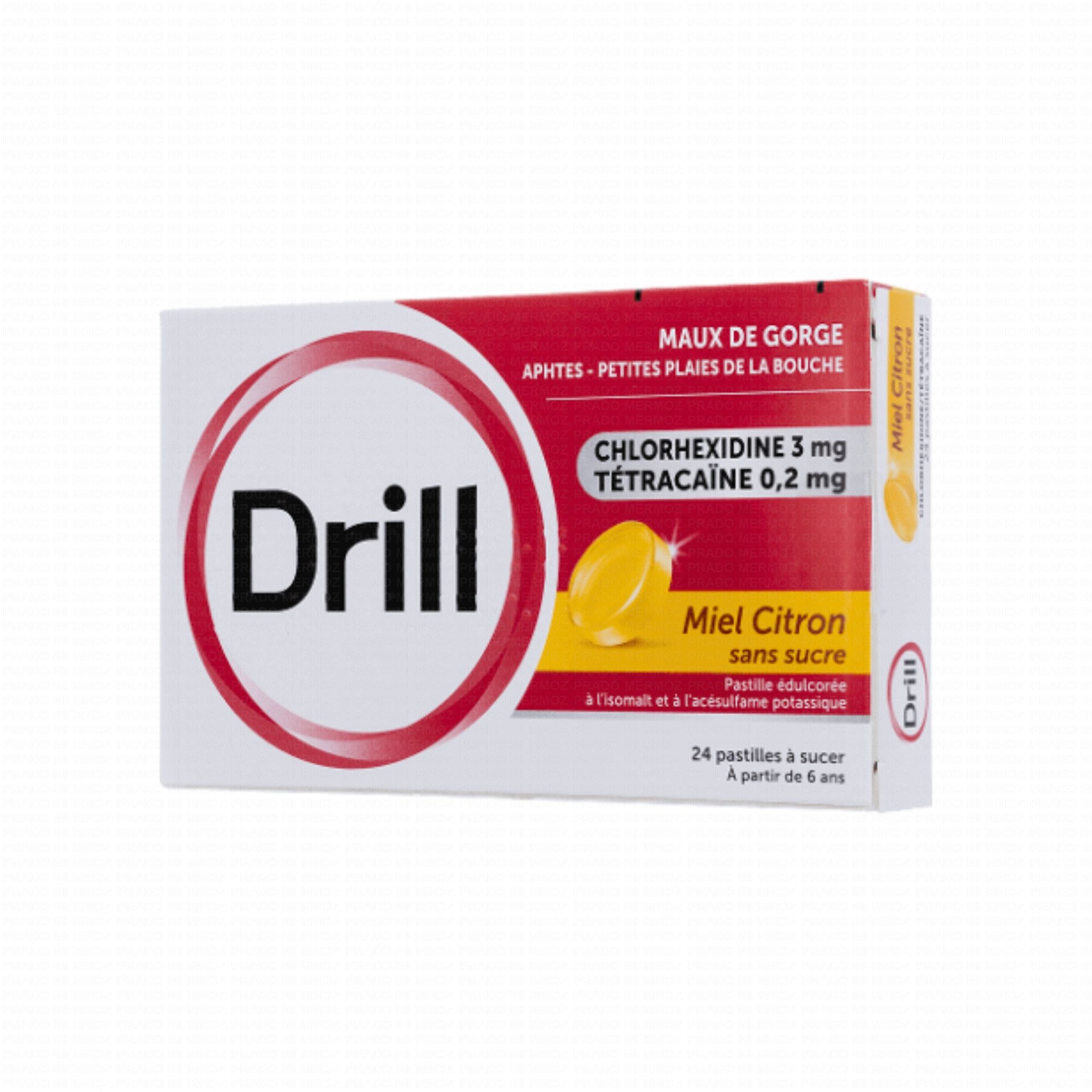 Traitement local d'appoint antibactérien et antalgique des affections limitées à la muqueuse buccale et à l'oropharynx (en cas de mal de gorge peu intense et sans fièvre, d'aphtes et de petites plaies de la bouche). NB : devant les signes cliniques généraux d'infection bactérienne, une antibiothérapie par voie générale doit être envisagée. DRILL MIEL CITRON SANS SUCRE est indiqué chez les adultes et les enfants de plus de 6 ans.