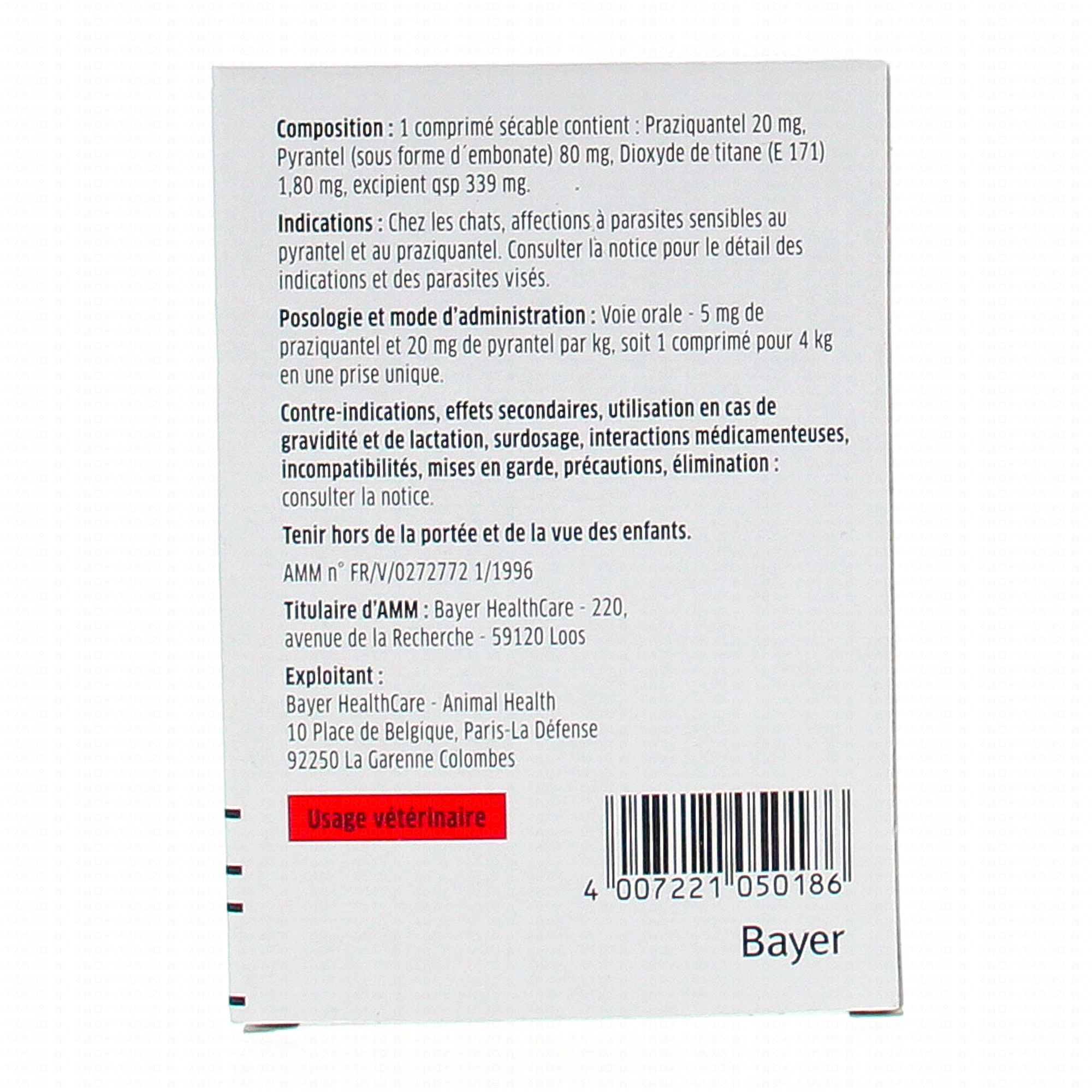 Praziquantel : 20mg, Pyrantel (sous forme d'embonate) 80ùg, Dioxyde de titane (E 171) 1.80mg, excipient qsp 339mg.