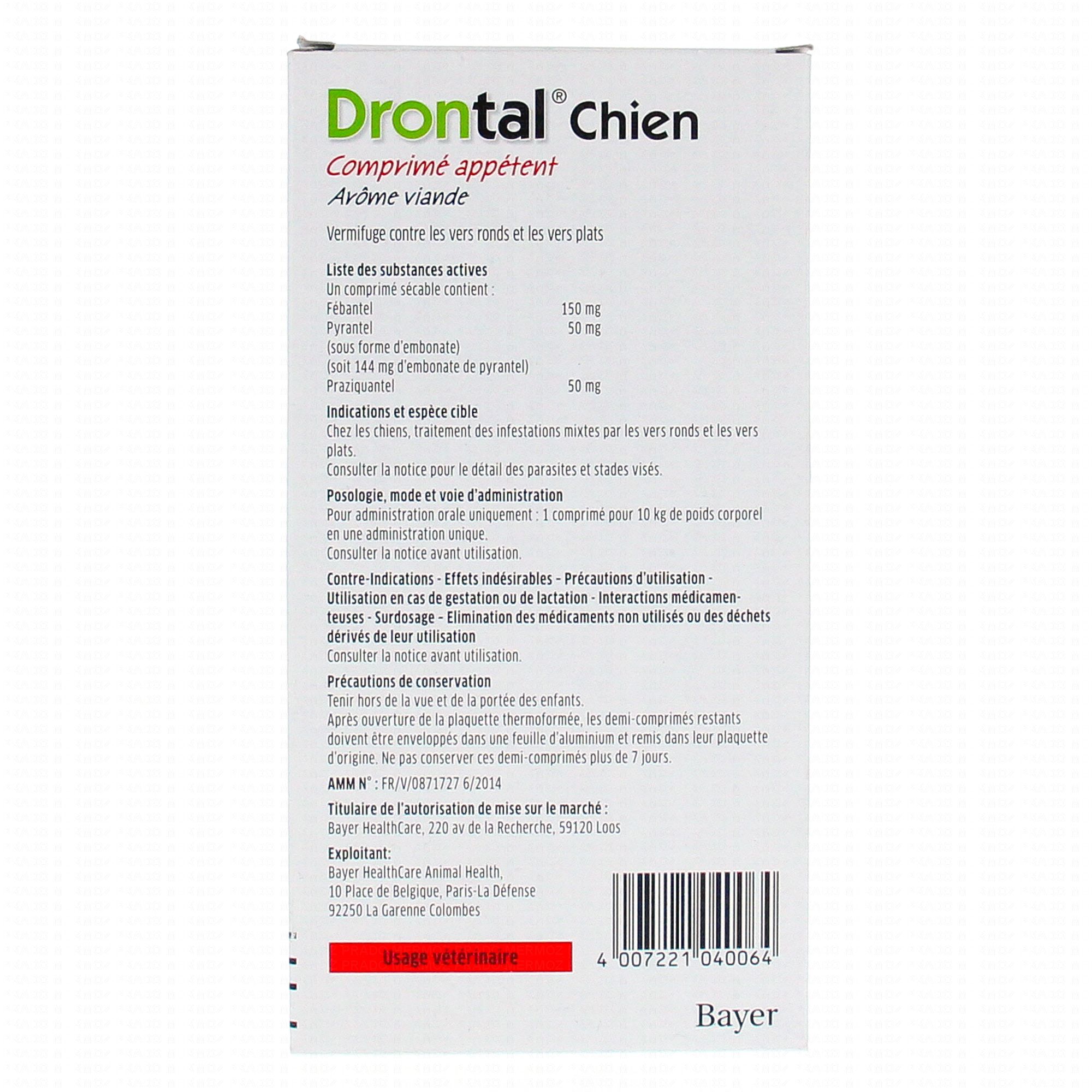 Drontal chien comprimé appétent Bayer est indiqué chez les chiens, dans le traitement des infestations mixtes par les vers ronds et les vers plats.