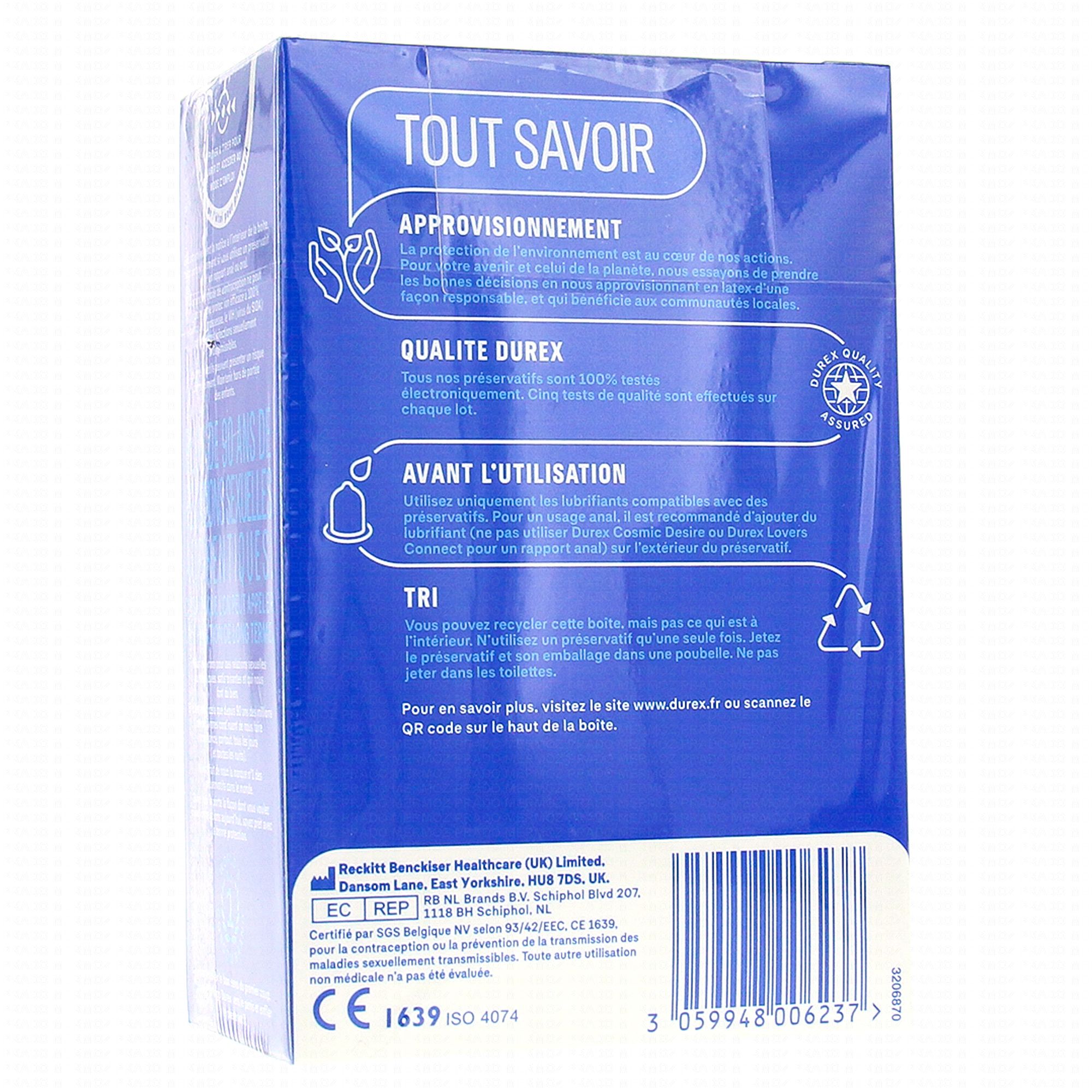 Les préservatifs DUREX sont de largeur 56mm. Ils sont épais et ultra lubrifiés pour procurer un plaisir maximal lors des rapports sexuels. Ils disposent d'un réservoir qui garantit plus de confort et ils ont été composé à partir d'une procédé qui permet une odeur agréable.