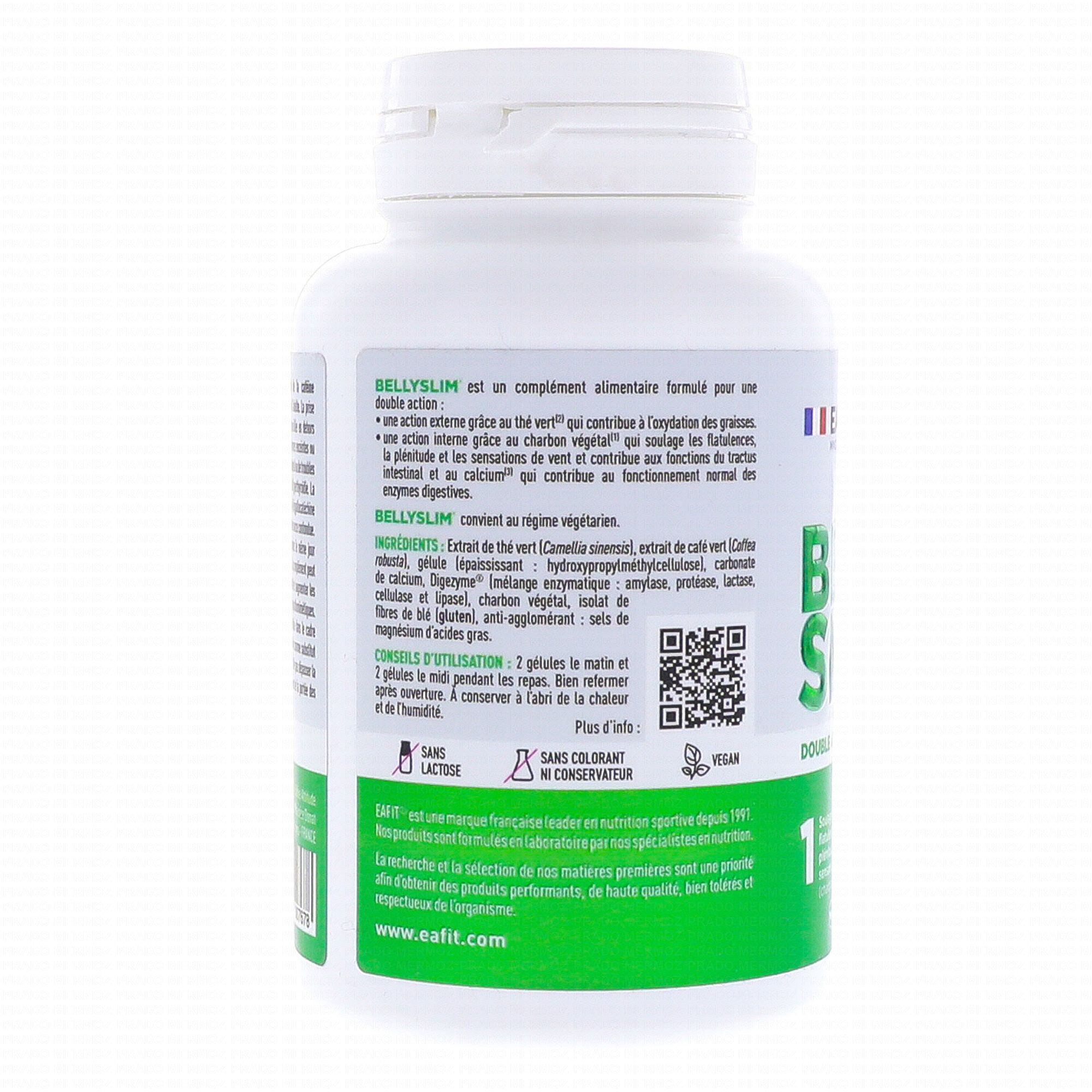 EAFIT Bellyslim minceur active ciblée pot de 90 gélules est un complément alimentaire qui grâce au thé vert et à la caféine contribue à la perte de poids en accompagnement d'un régime approprié. Le charbon végétal participe au confort digestif. Le Calcium aide au fonctionnement normal des enzymes digestives.