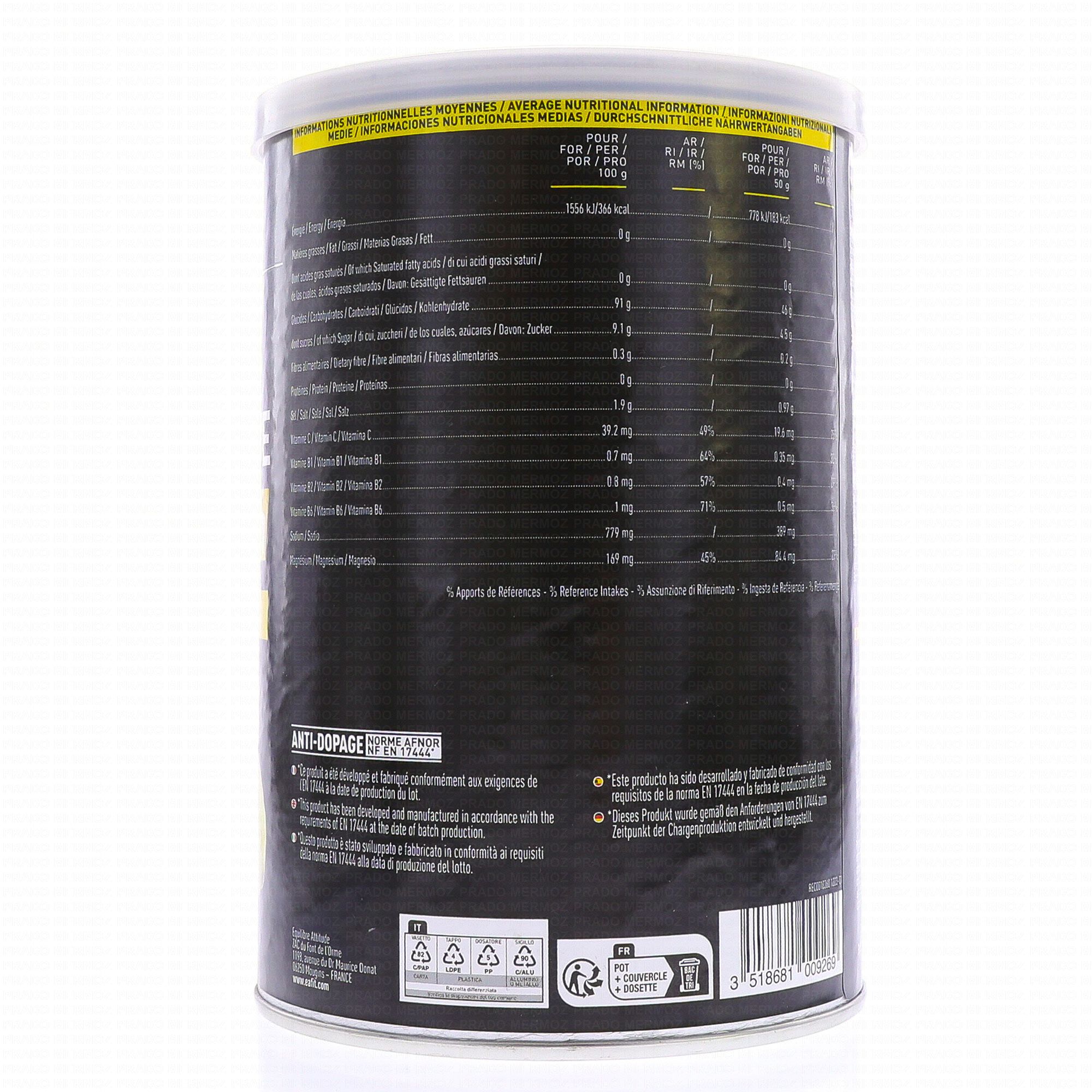 Préparation pour boisson de l'effort sous forme de poudre. Le produit est destiné, compte tenu d'une alimentation normale, à répondre aux besoins d'un effort musculaire immédiat effectué notamment lors d'une compétition ou dans des conditions d'environnement spéciales. À consommer de préférence avant la date indiquée sous le pot.