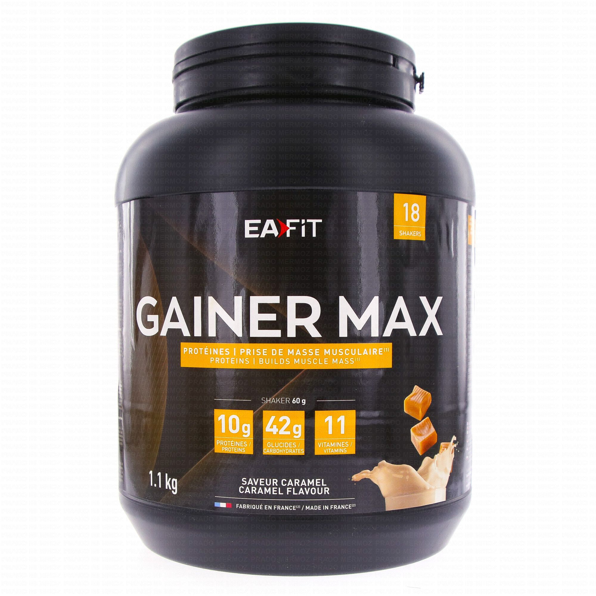 EAFIT Gainer max saveur prise de masse caramel pot de 1.1 kg. contient les éléments suivants :