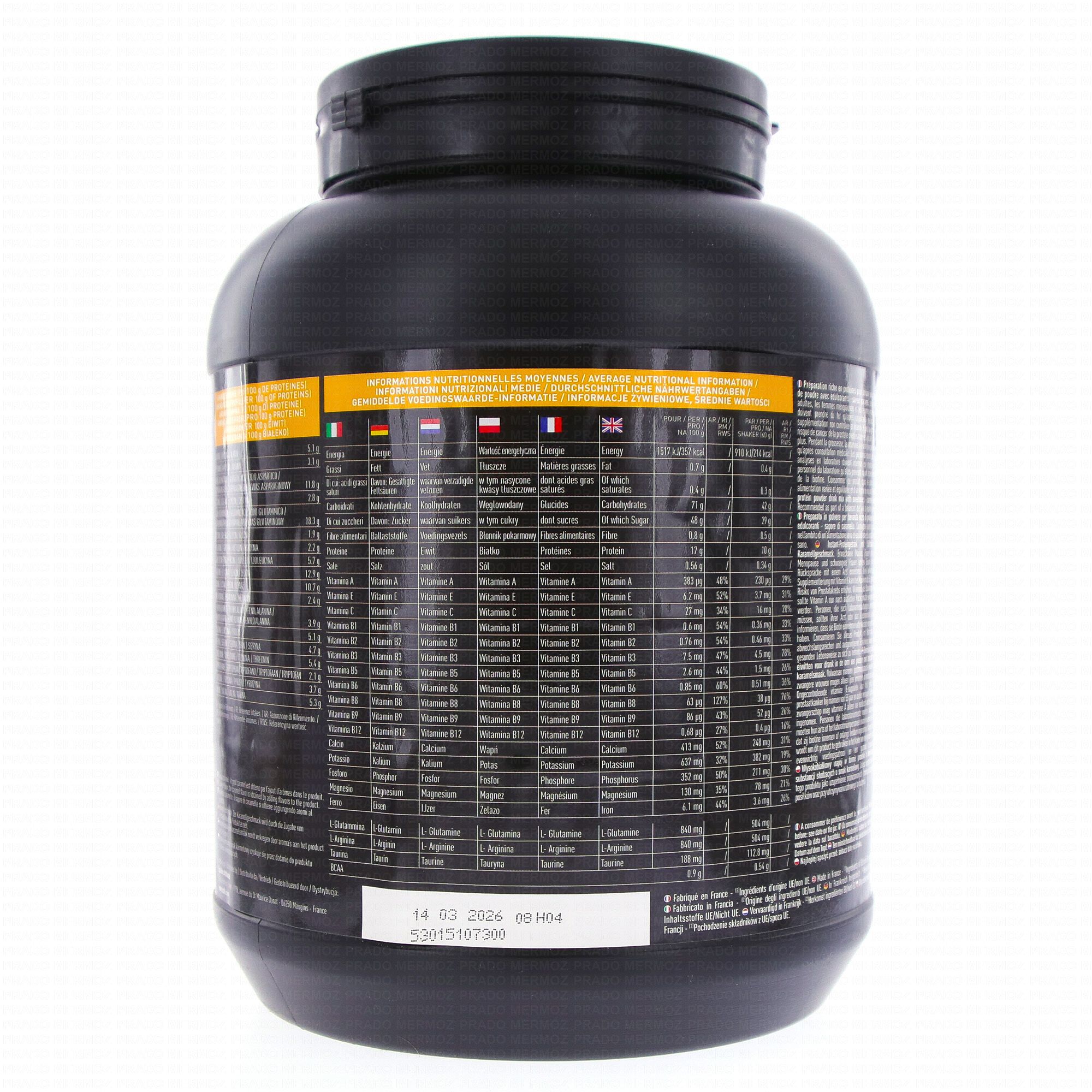 Ingrédients : complexe glucidique 54.8% (fructose, maltodextrines, dextrose, amidon de maïs, farine d'avoine (gluten), patate douce en poudre), lait écrémé en poudre, protéines de lactosérum 5% (lait) (émulsifiant : lécithine de tournesol, phosphate tricalcique), arômes, poudre de blanc d'œuf, L-glutamine, L-arginine HCL, taurine, minéraux : oxyde de magnésium - pyrophosphate de fer, vitamines : C-E-PP-A-B5-B6-B2-B1-B9-B8.