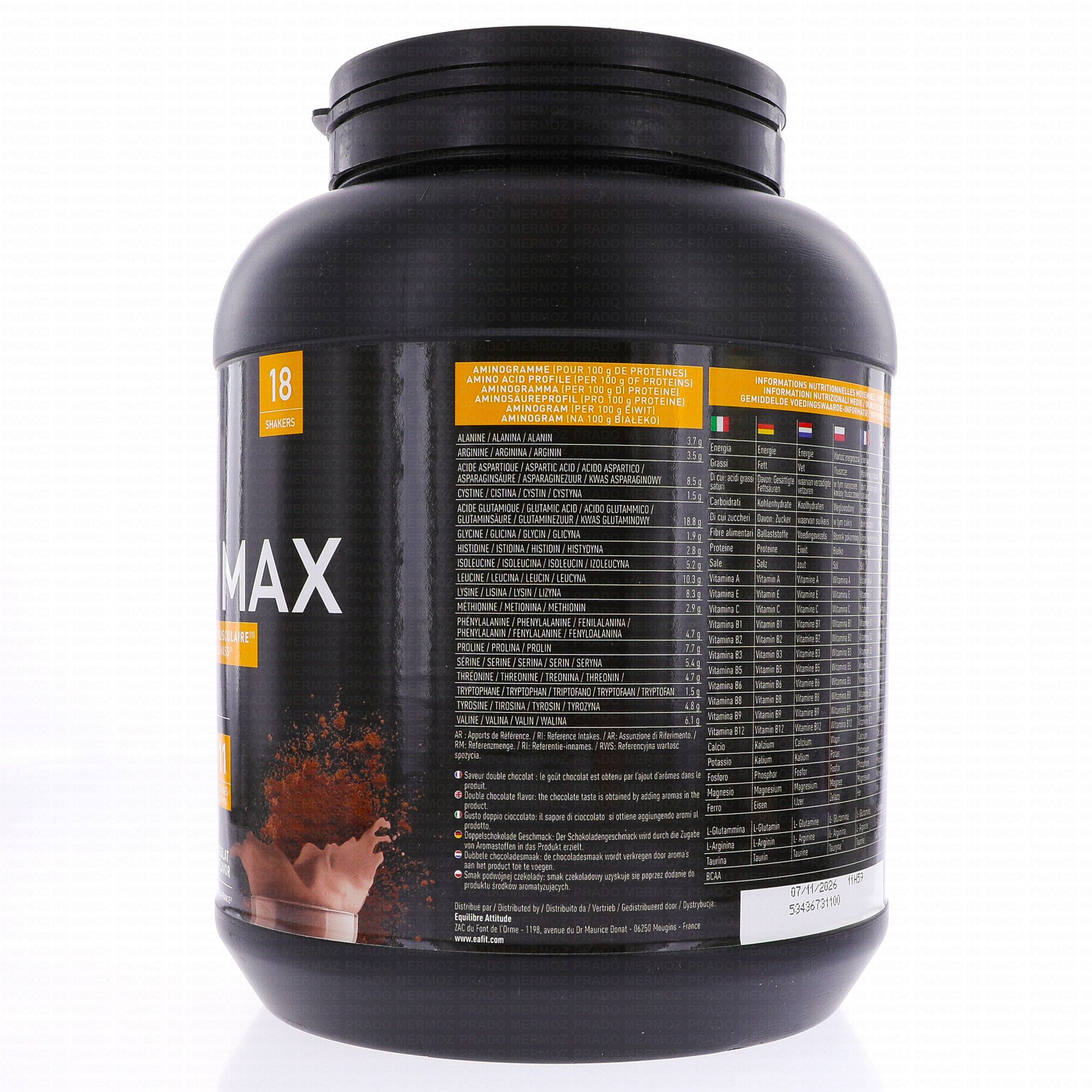 EAFIT Gainer max prise de masse saveur double chocolat pot de 1.1 kg.à base de proteines de blanc d'oeufs enrichi en vitamines, minéraux et acides aminés. Convient aux régimes sportifs hyperproteinés.