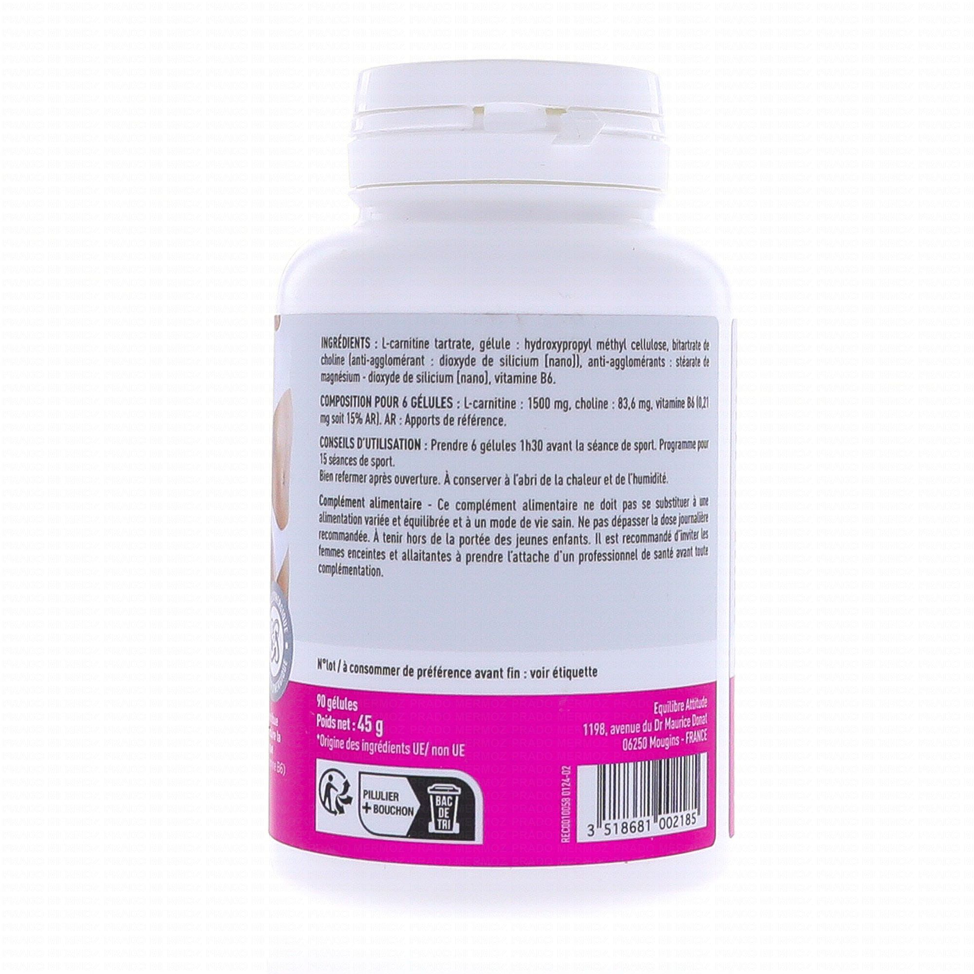 Ingrédients : L-carnitine tartrate ; bitartrate de choline, antiagglomérants : stéarate de magnésium - [nano] dioxyde de silicium, vitamine B6 (chlorydrate de pyridoxine). Gélule : hydroxypropyl méthyl cellulose.