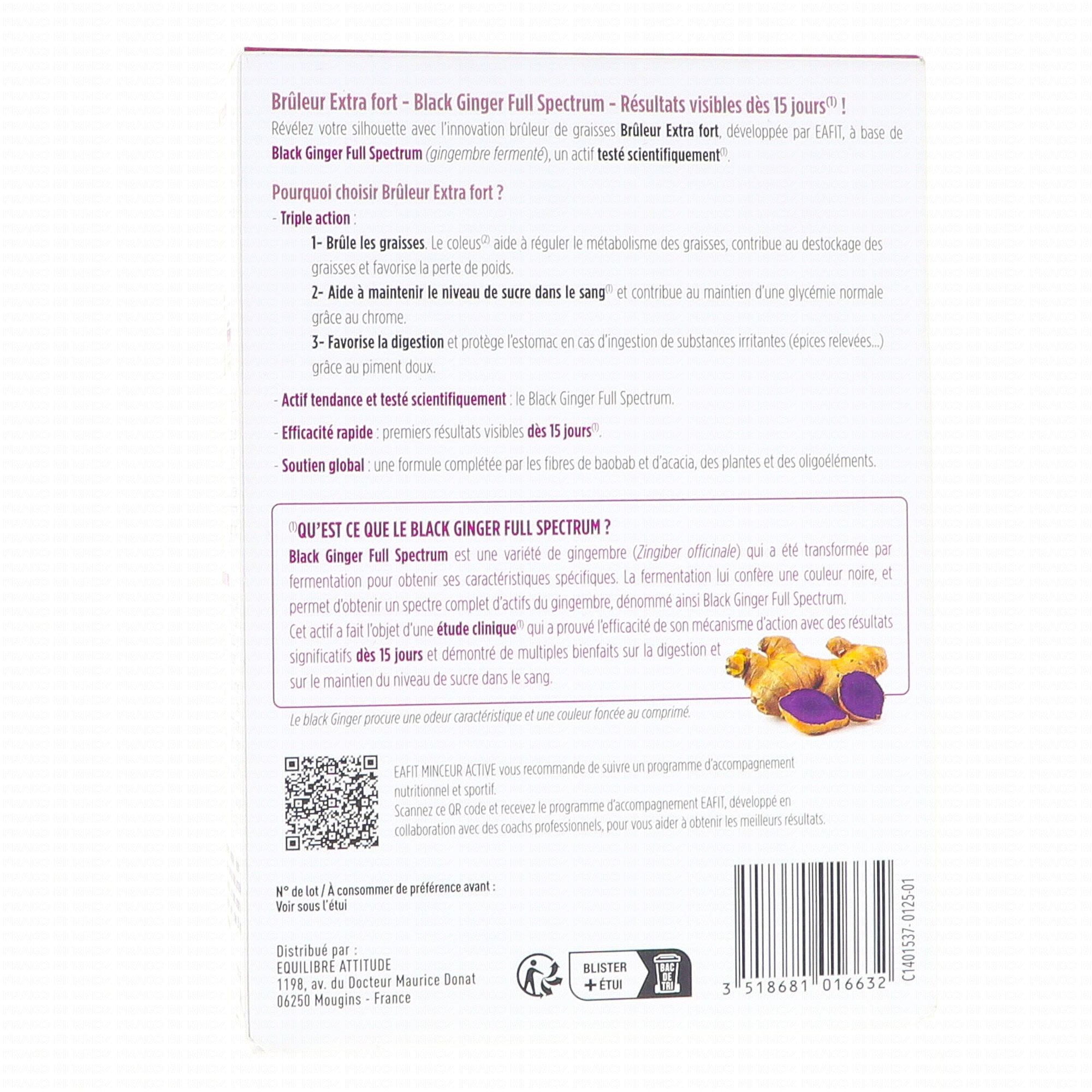 EAFIT Minceur 360 Brûleur Extra Fort est un complément alimentaire aux extraits végétaux de Black Ginger, de piment et de Coleus Forskohlii. Il contient également de la caféine et du chrome.