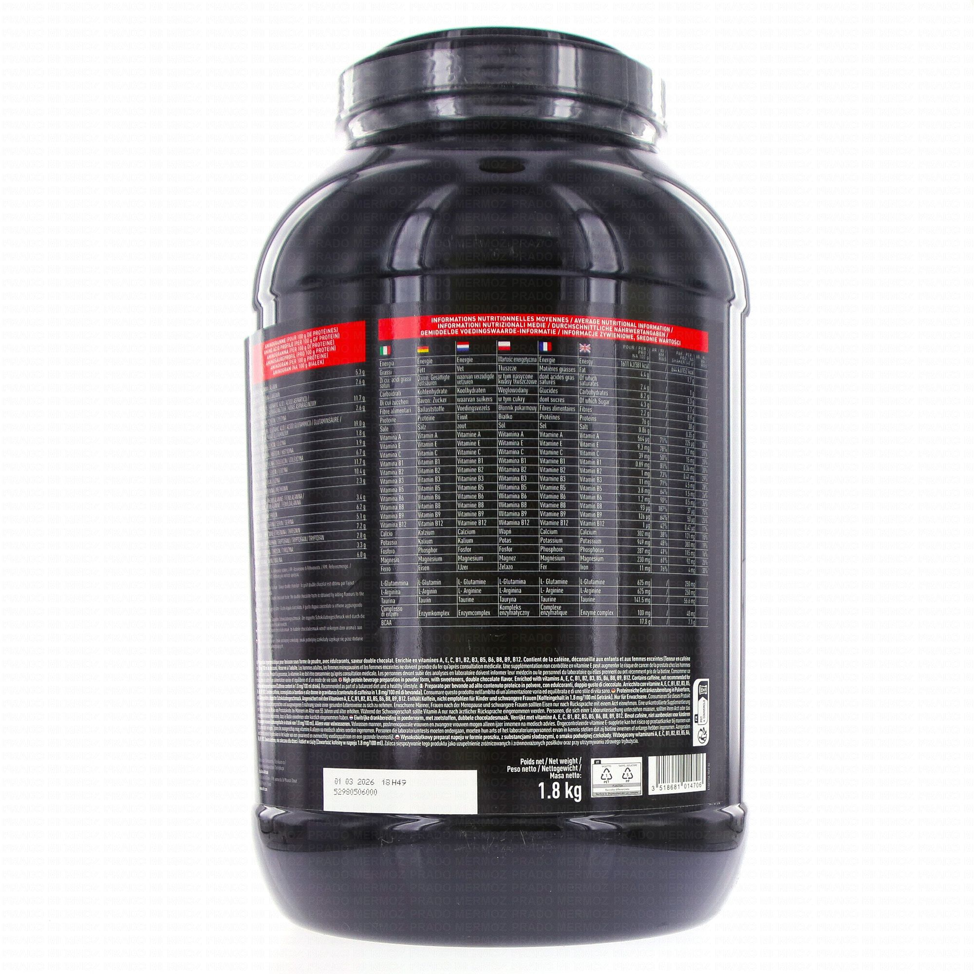 Ingrédients : concentrat de protéines de lactosérum 42,7% (émulsifiant : lécithine de tournesol, phosphate tricalcique) (lait), isolat de protéines de lactosérum 36,2% (émulsifiant : lécithine de soja) (lait), hydrolysat de protéines de lactosérum 10% (lait), poudre de cacao maigre 5%, arômes, épaississant : gomme xanthane, l-glutamine, l-arginine HCL, minéraux : oxyde de magnésium - pyrophosphate de fer, édulcorants : acésulfame de potassium - sucralose, taurine, vitamines C-E-PP-AB5-B6-B2-B1-B12-B9-B8, complexe enzymatique (alpha amylase - protéase - lactase - lipase - cellulase), maltodextrines.