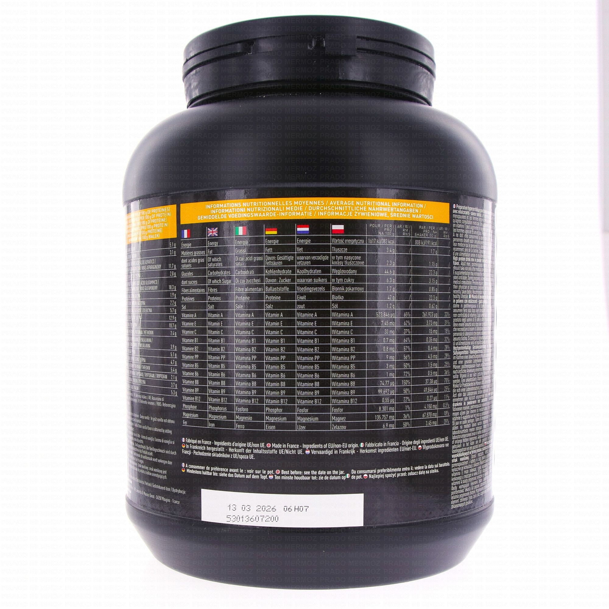 Ingrédients: Protéines de lactosérum (émulsifiant : lécithine de tournesol, phosphate tricalcique) (lait), maltodextrines, arômes (lait), épaississants : carraghénanes, gomme xanthane, hydrolysat de protéines de lactosérum (lait), inuline, minéraux : pyrophosphate de fer, oxyde de magnésium, vitamines : C, E, PP, A, B5, B6, B2, B1, B12, B9, B8, édulcorants : acésulfame de potassium, sucralose, colorant : bétacarotène. Traces éventuelles de : céréales contenant du gluten, oeufs, soja, fruits à coque, céleri et sulfites.