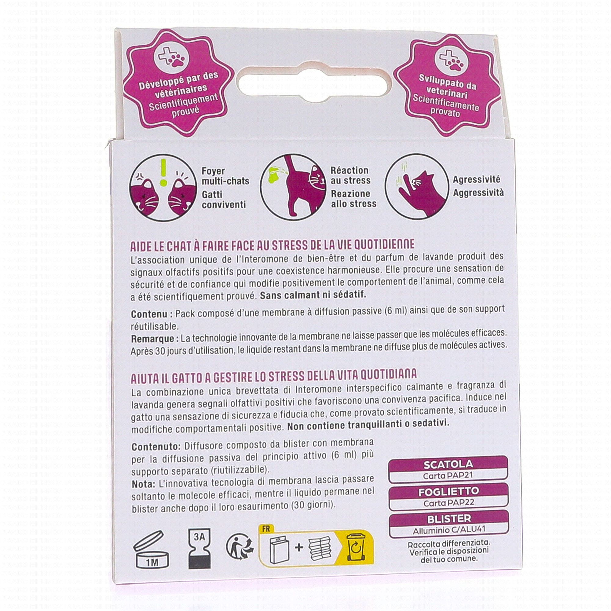L'interomone naturelle de bien-être (0,01 %, E-2-methylbut-2-enal) est un composé chimique inspiré des phéromones, qui influence le système olfactif de l'animal. Associée au parfum de lavande, elle crée une atmosphère sereine et chaleureuse. Ce mélange unique est scientifiquement prouvé pour réduire l'anxiété et favoriser une coexistence harmonieuse, même dans un foyer avec plusieurs chats.