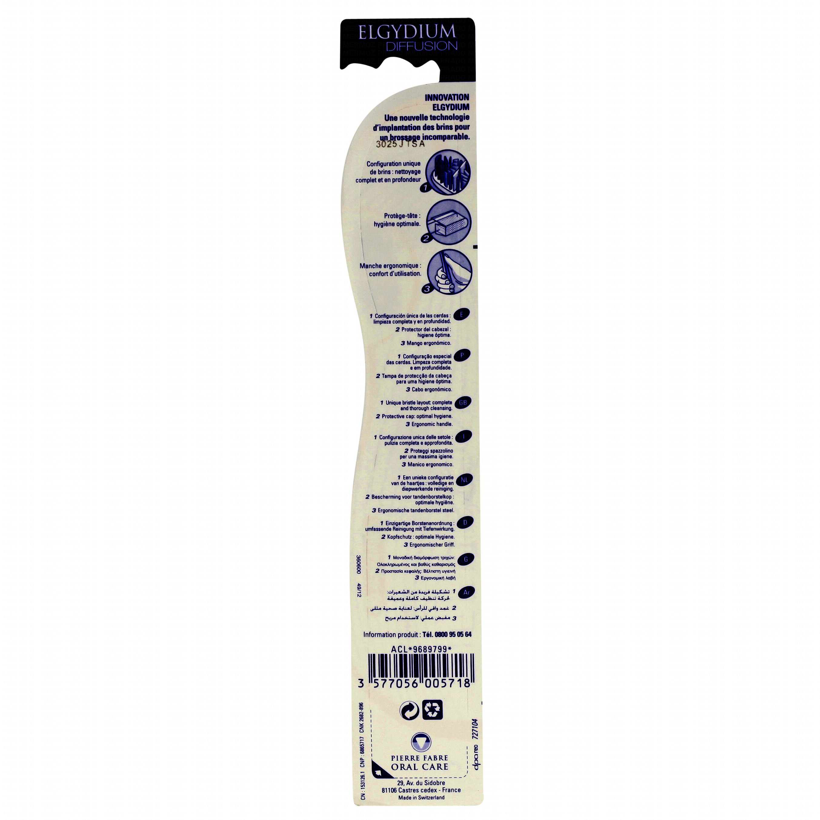 Spécialement conçues en respectant une technologie d'implantation des brins pour un brossage efficace qui respecte les dents et les gencives, les Brosses à dents Elgydium Diffusion favorisent une hygiène bucco-dentaire quotidienne irréprochable. Manche translucide, long et incurvé, avec butée de préhension. Tête ovale garnie de brins aux extrémités arrondies de forme longitudinale et transversale avec gratte langue au dos de la tête. Coloris : assortis. Conditionnement : carte blister.
