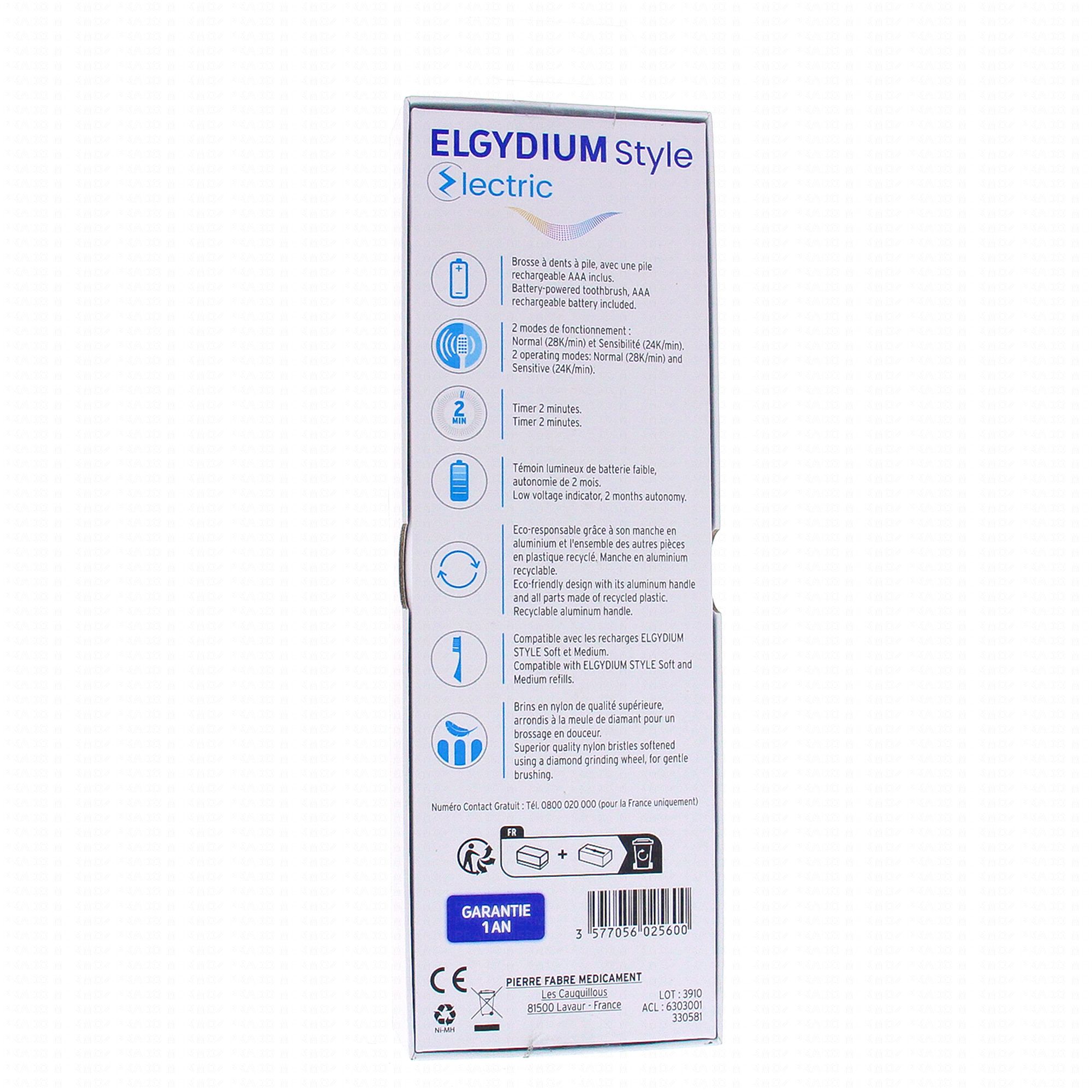 • EFFICACE, la brosse à dents Elgydium Style Electric élimine la plaque dentaire efficacement et en douceur.