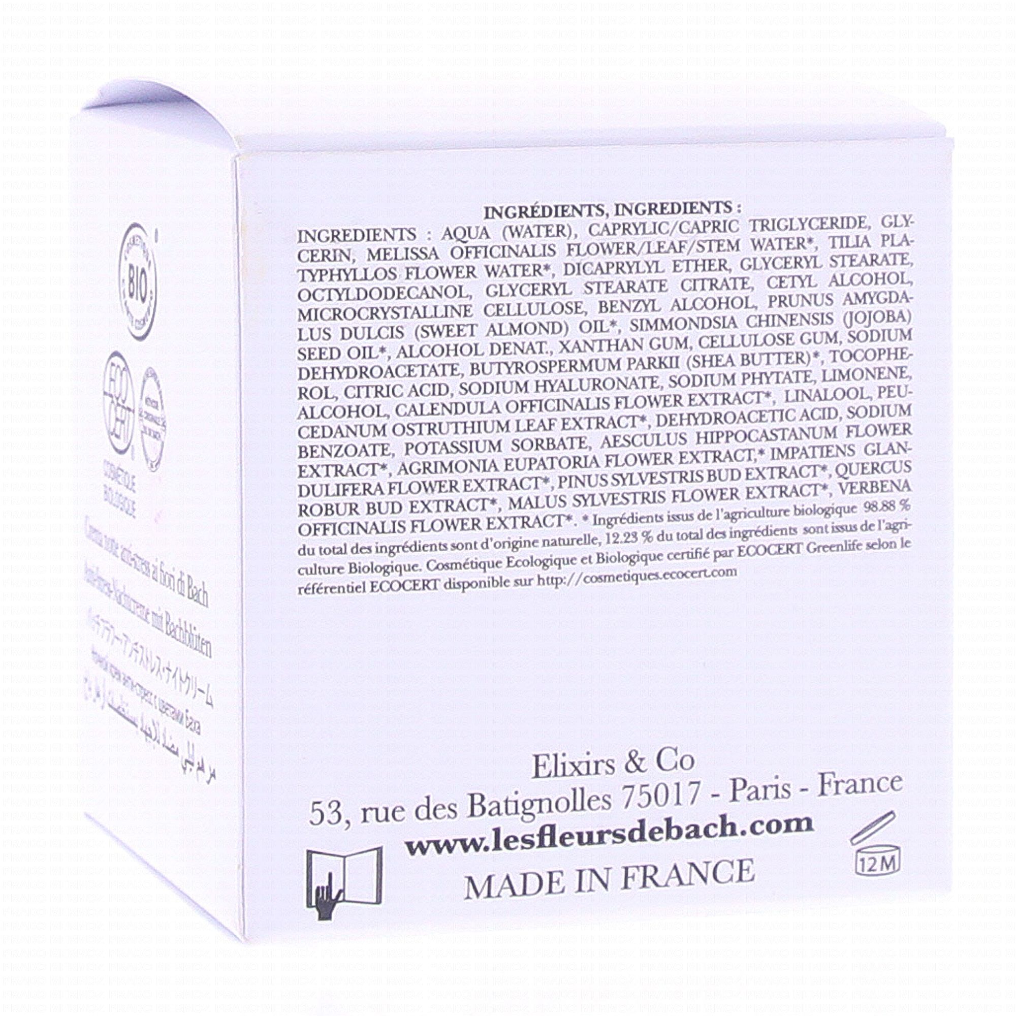 Les fleurs de Bach contenues dans cette crème sont : l'Aigremoine, le Chêne, l'Impatiente, le Marronnier blanc, le Pin, le Pommier sauvage, la Verveine.