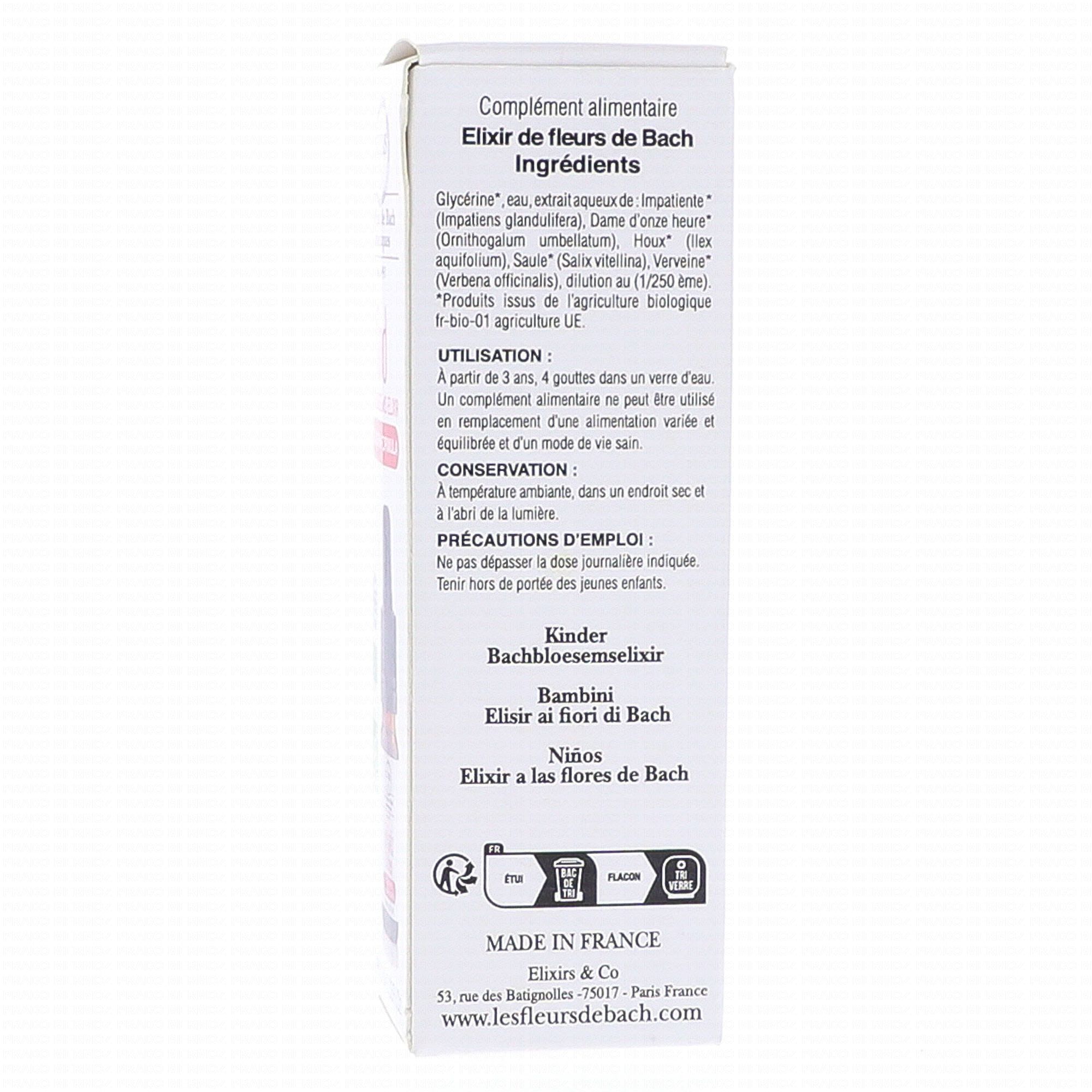 Elixirs & Co Enfants est un complément alimentaire aux Fleurs de Bach, destiné aux enfants à partir de 3 ans. La dose conseillée est de 4 gouttes par jour, à diluer dans un verre d'eau.