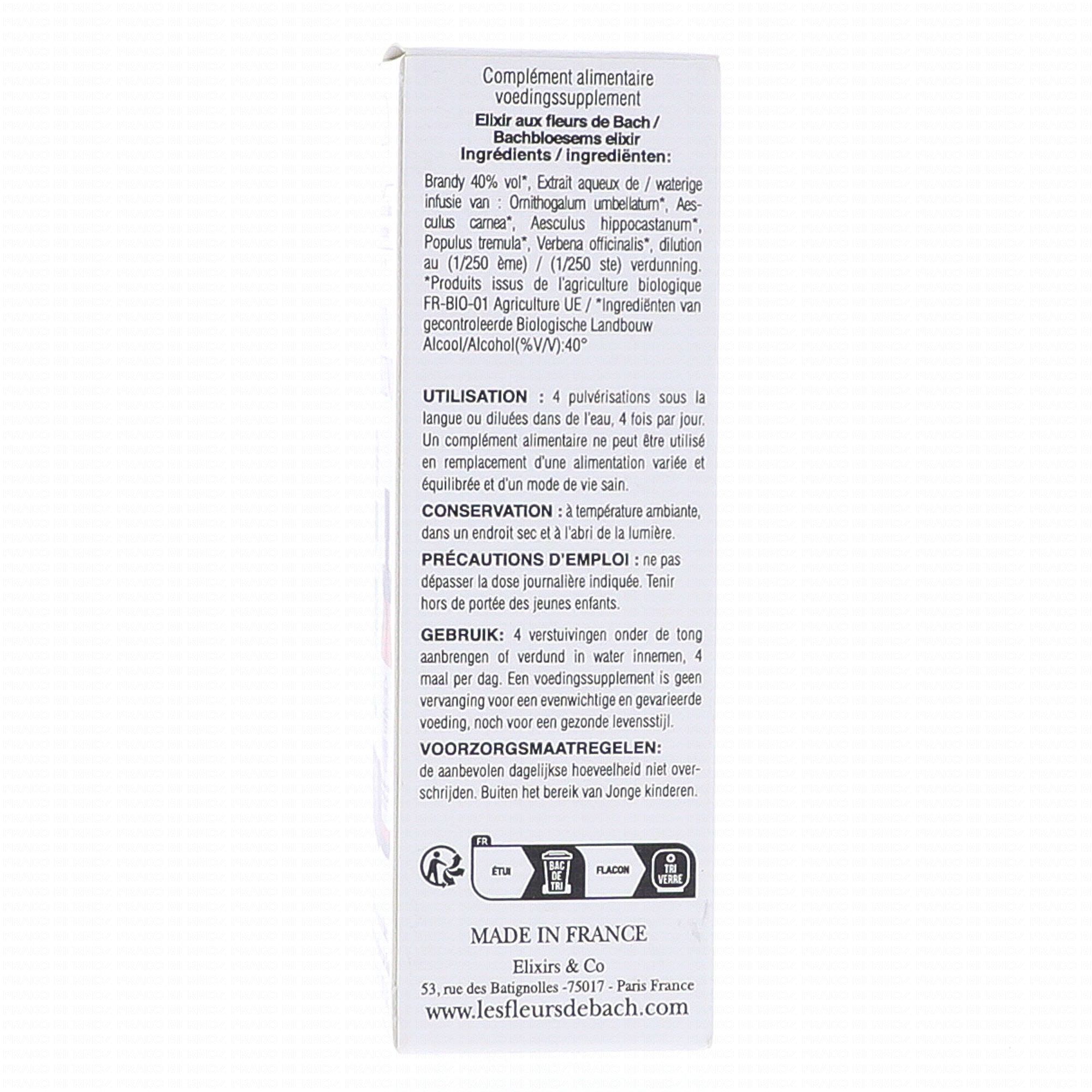 Brandy bio (99,6%) 40% vol, extraits aqueux de plantes* 0,4% (1/250) : Damed'onzeheures (Star of Bethlehem / Ornithogallum umbellatum), Marronnier blanc (White chestnut / Aesculus hippocastanum), Marronnier rouge (Red chestnut / Aesculus carnea), Tremble (Aspen / Populus tremula), Verveine (Vervain / Verbena officinalis).
