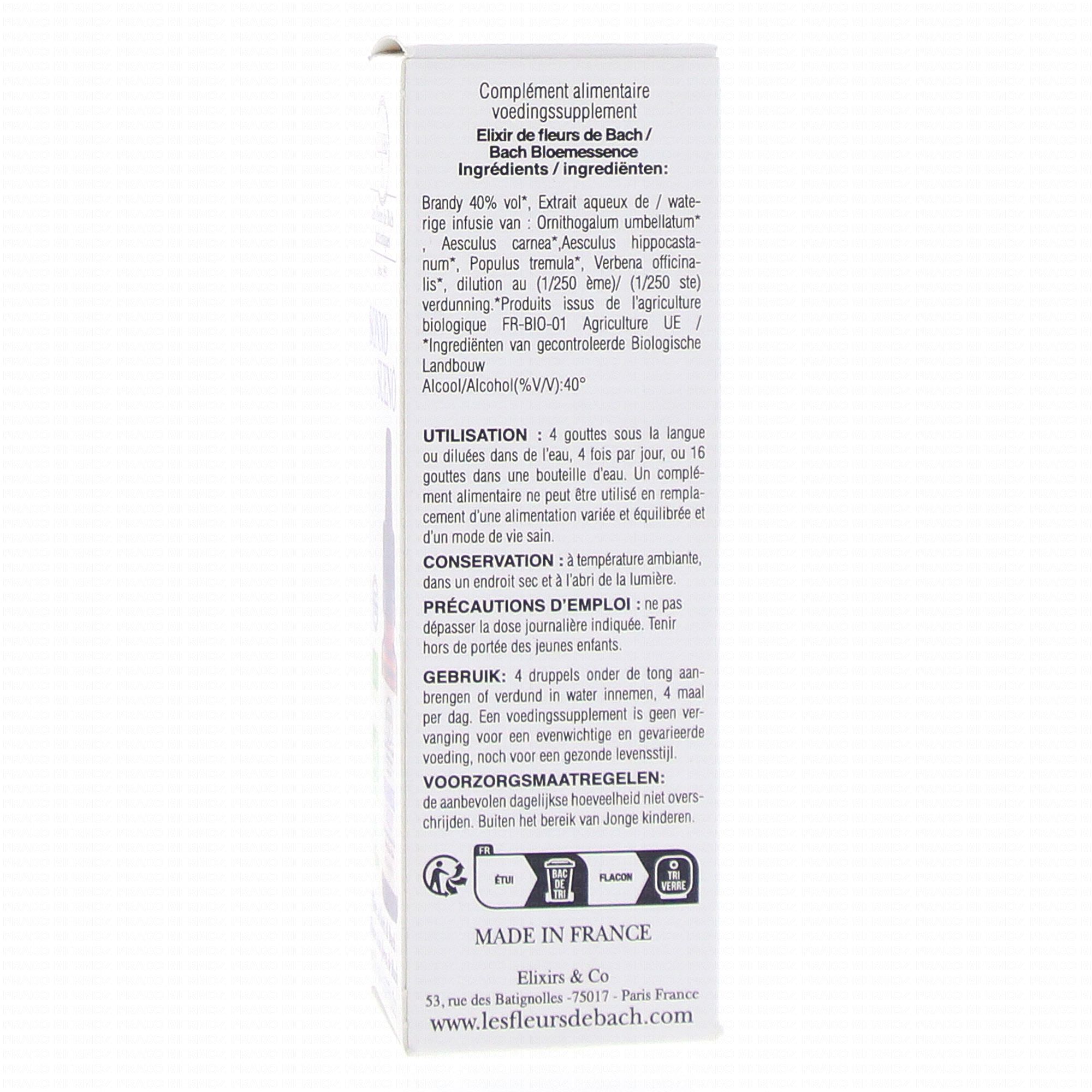 Brandy bio (99,6%) 40% vol, extraits aqueux de plantes* 0,4% (1/250) : Damed'onzeheures (Star of Bethlehem / Ornithogallum umbellatum), Marronnier blanc (White chestnut / Aesculus hippocastanum), Marronnier rouge (Red chestnut / Aesculus carnea), Tremble (Aspen / Populus tremula), Verveine (Vervain / Verbena officinalis).