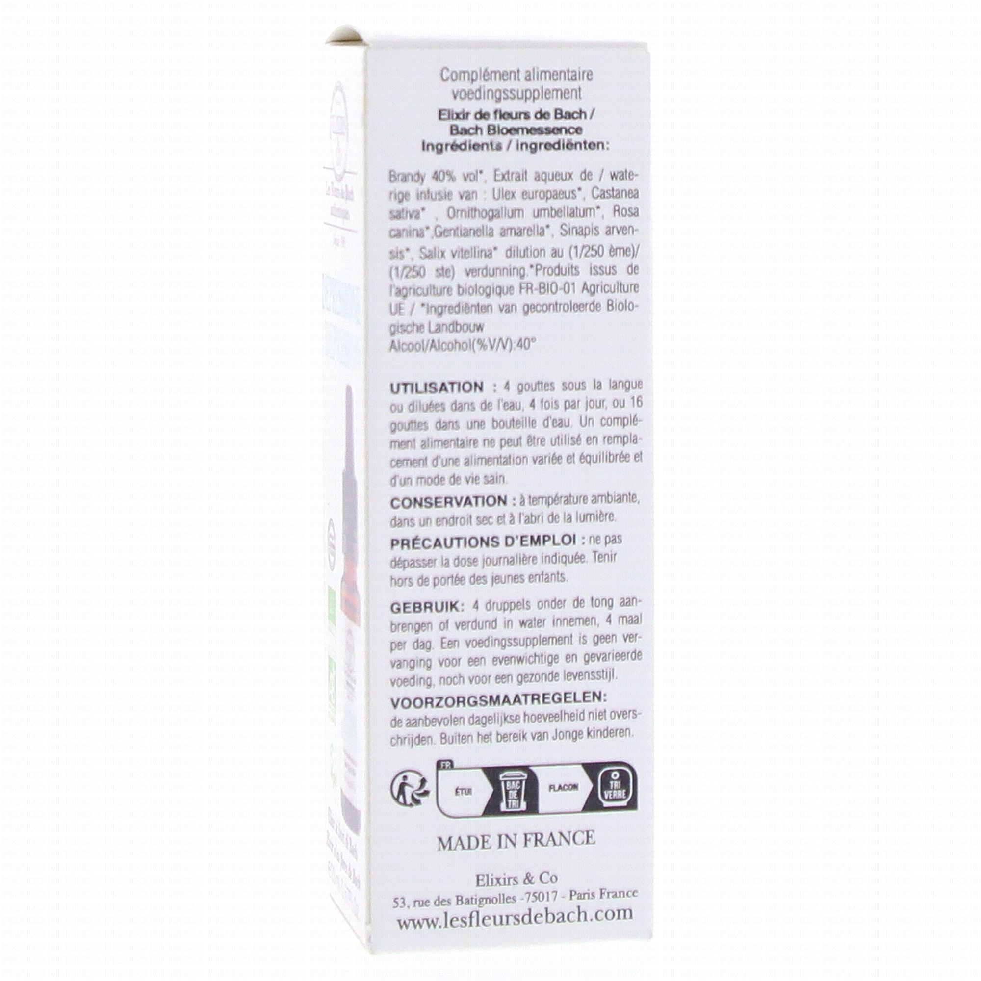 Brandy bio (99,6%) 40% vol, extraits aqueux de plantes* 0,4% (1/250) : Ajonc (Gorse / Ulex europaeus), Châtaigner (Sweet chestnut / Castanea sativa), Damed'onzeheures (Star of Bethlehem / Ornithogallum umbellatum), Eglantine (Wild rose / Rosa canina), Gentiane (Gentian / Gentianella amarella), Moutarde (Mustard / Sinapis arvensis), Saule (Willow / Salix vitellina).