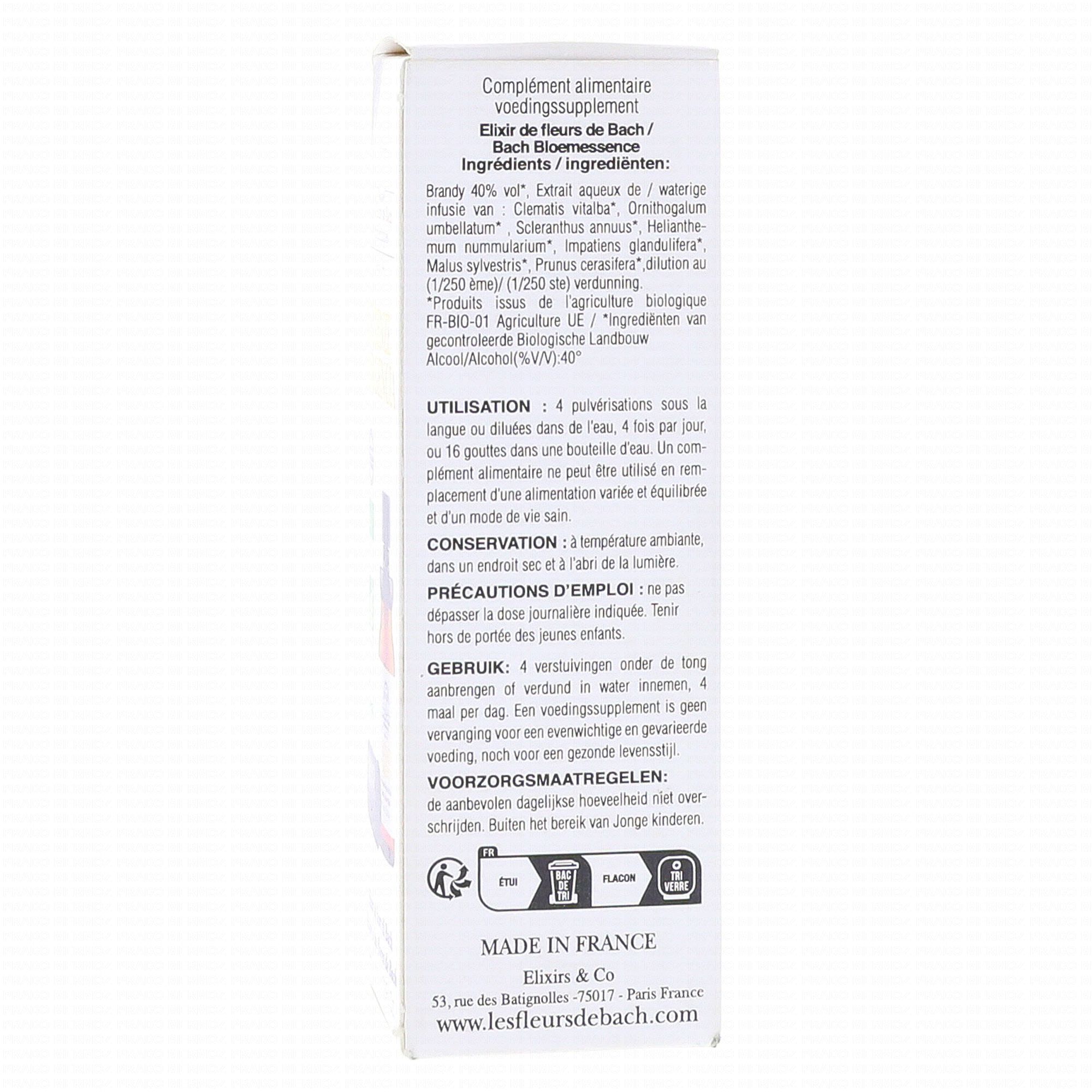 Brandy bio (99,6%) 40% vol, extraits aqueux de plantes* 0,4% (1/250) : Clématite (clematis/clematis vitalba), Dame-d'onze-heures (Star of Bethlehem / ornithogalum umbellatum), Gnavelle (Scleranthus / Scleranthus annuus), Hélianthème (Rockrose / helianthemum nummularium), Impatiente (Impatiens / Impatiens glandulifera), Pommier sauvage (Crab apple / Malus silvestris), Prunus (Cherry plum / Prunus Cerasifera). *Ingrédients issus de l'Agriculture Biologique