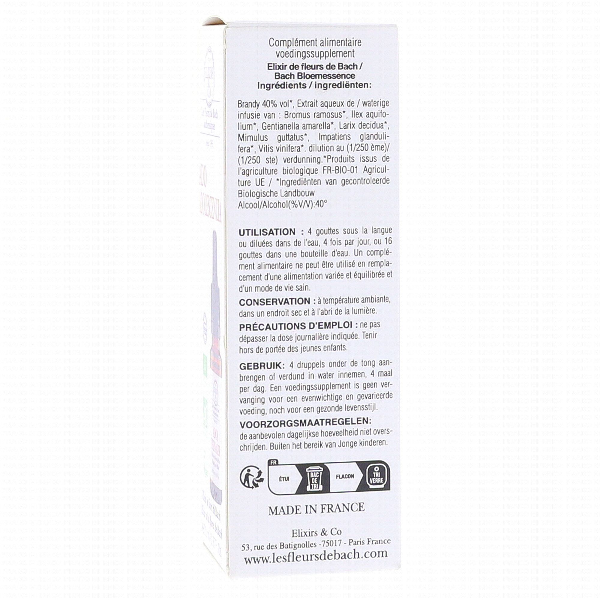 Brandy bio (99,6%) 40% vol, extraits aqueux de plantes* 0,4% (1/250) : Avoine sauvage (Wild oat / Bromus ramosus), Gentiane (Gentian / Gentianella amarella), Houx (Holly / Ilex aquifolium), Impatiente (Impatiens / Impatiens glandulifera), Mélèze (Larch / Larix decidua), Mimule (Mimulus / Mimulus guttatus), Vigne (Vine / Vitis vinifera).