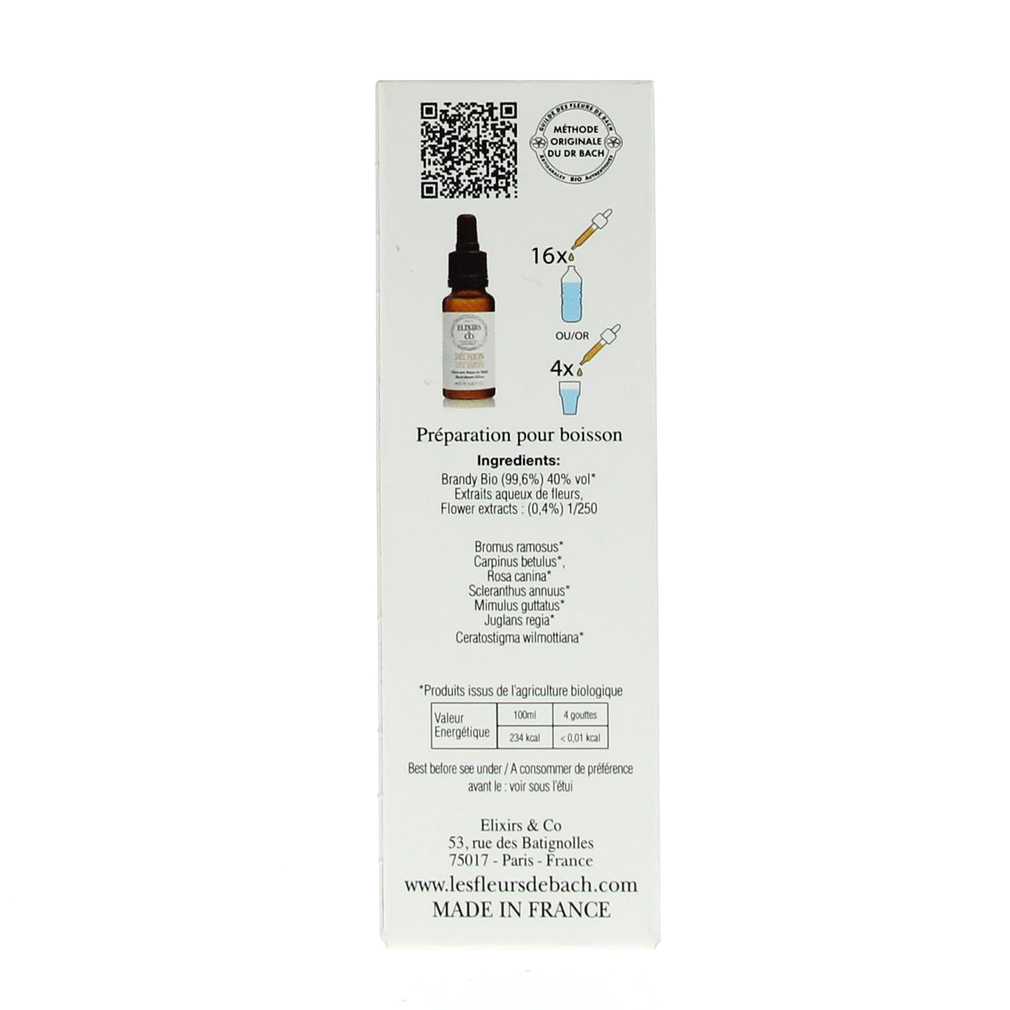 Ingrédients: Brandy bio (99.6%) 40% vol*; extrait aqueux de fleurs/flower extract: (0.4%) 1/250 ; bromus ramosus* ; carpinus betulus* ; rosa canina* ; scleranthus annuus* ; mimulus guttatus* ; juglans regia* ; ceratostigma wilmottiana*.
