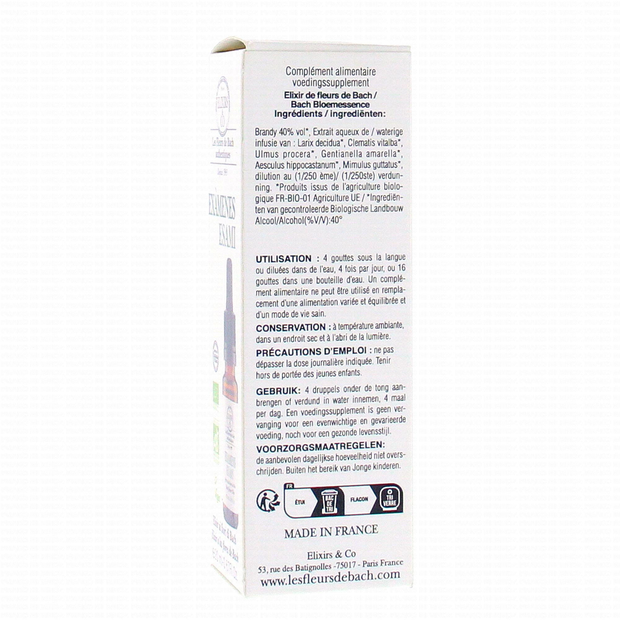 Brandy Bio (99,6%) 40% vol* Extraits aqueux de fleurs, Flower extracts (0,4%) 1/250 : Larix decidua*, Clematis vitalba*, Ulmus procera*, Gentianella amarella*, Aesculus hippocastanum*, Mimulus guttatus*. *Ingrédients issus de l'Agriculture Biologique