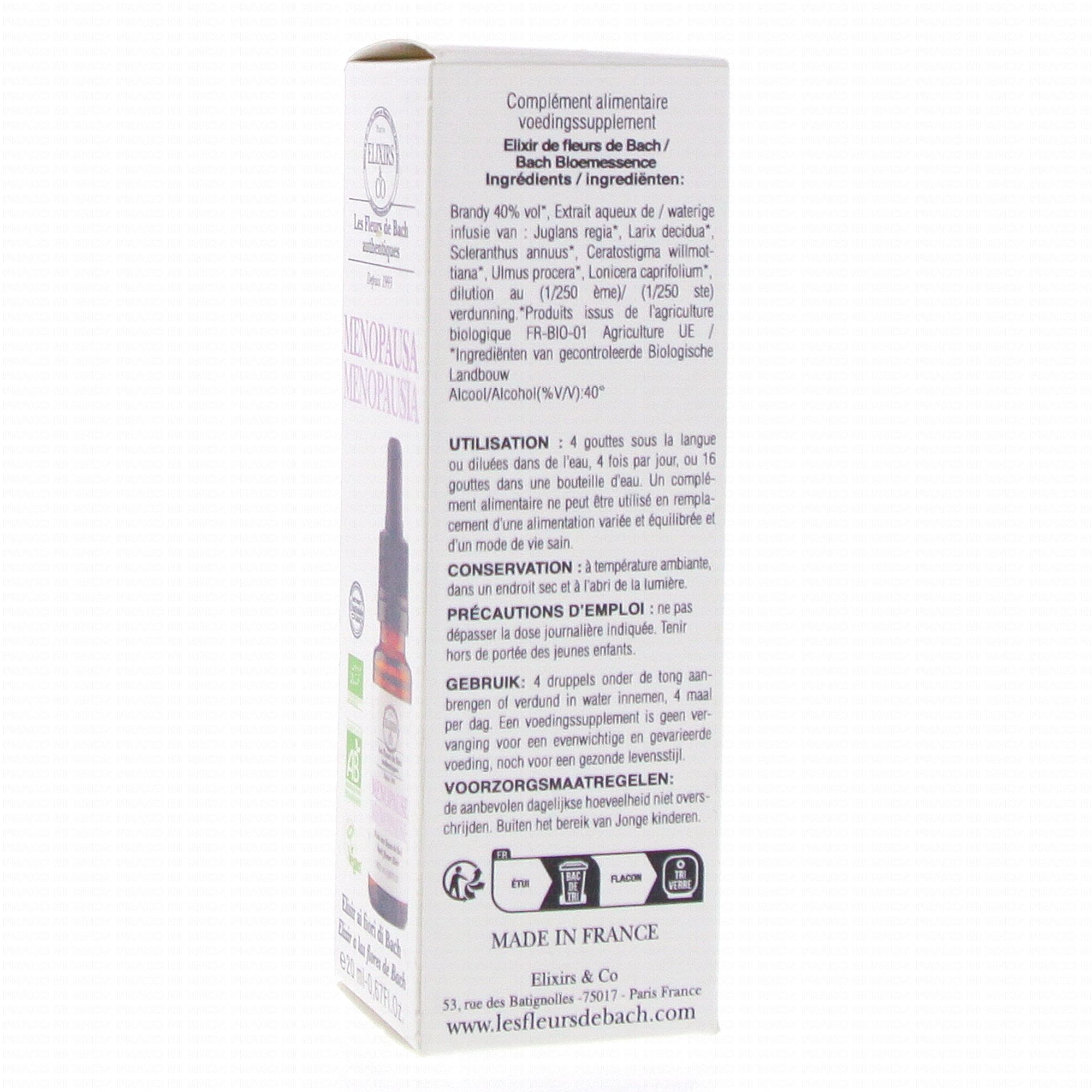ELIXIRS & CO Les fleurs de bach Ménopause Flacon 20ml contient les éléments suivants :
