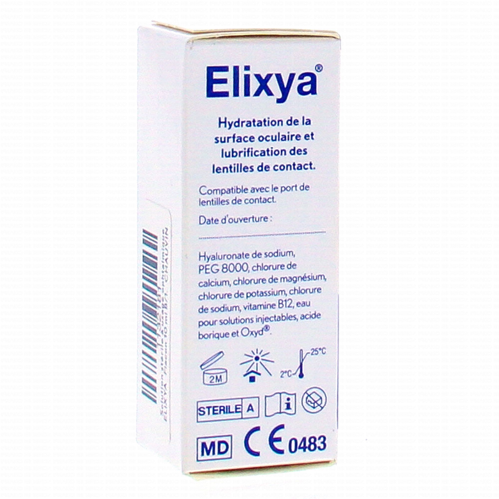 Elixya est une solution ophtalmique fabriquée à partir de hyaluronane de sodium, de vitamine B12 et de PEGG 8000. Il hydrate la surface oculaire et lubrifie les lentilles de contact, évitant ainsi toute sensation de dessèchement