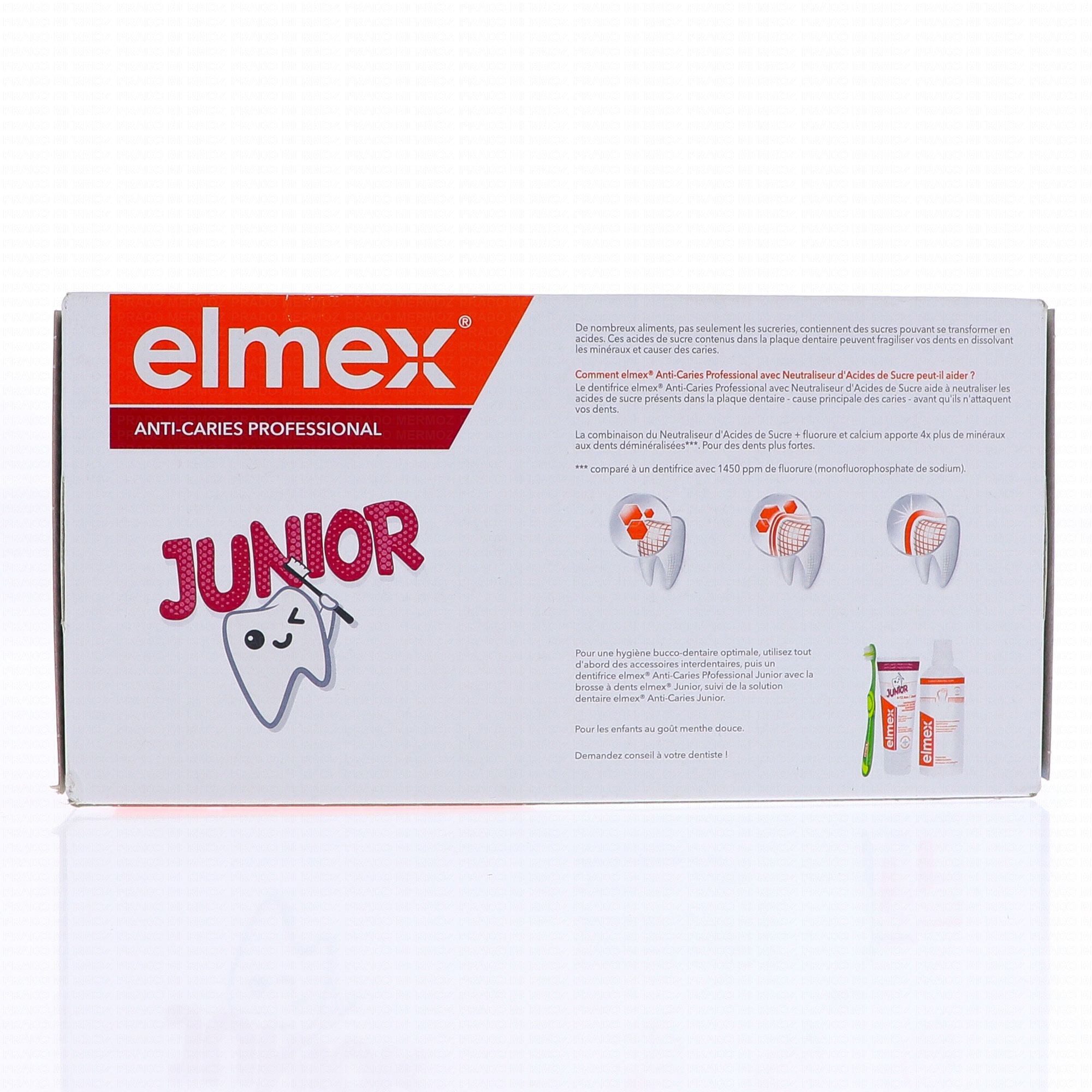 Protégez vos dents des acides de sucre grâce au dentifrice elmex® Anti-caries Professional Junior. Ce dentifrice fluoré neutralise les acides de sucre produits par les bactéries présentes dans la plaque dentaire avant qu'ils n'attaquent les dents. L'association de cette technologie Neutraliseur d'Acides de Sucre, de fluor et de calcium apporte 4 fois plus de minéraux aux dents déminéralisées.