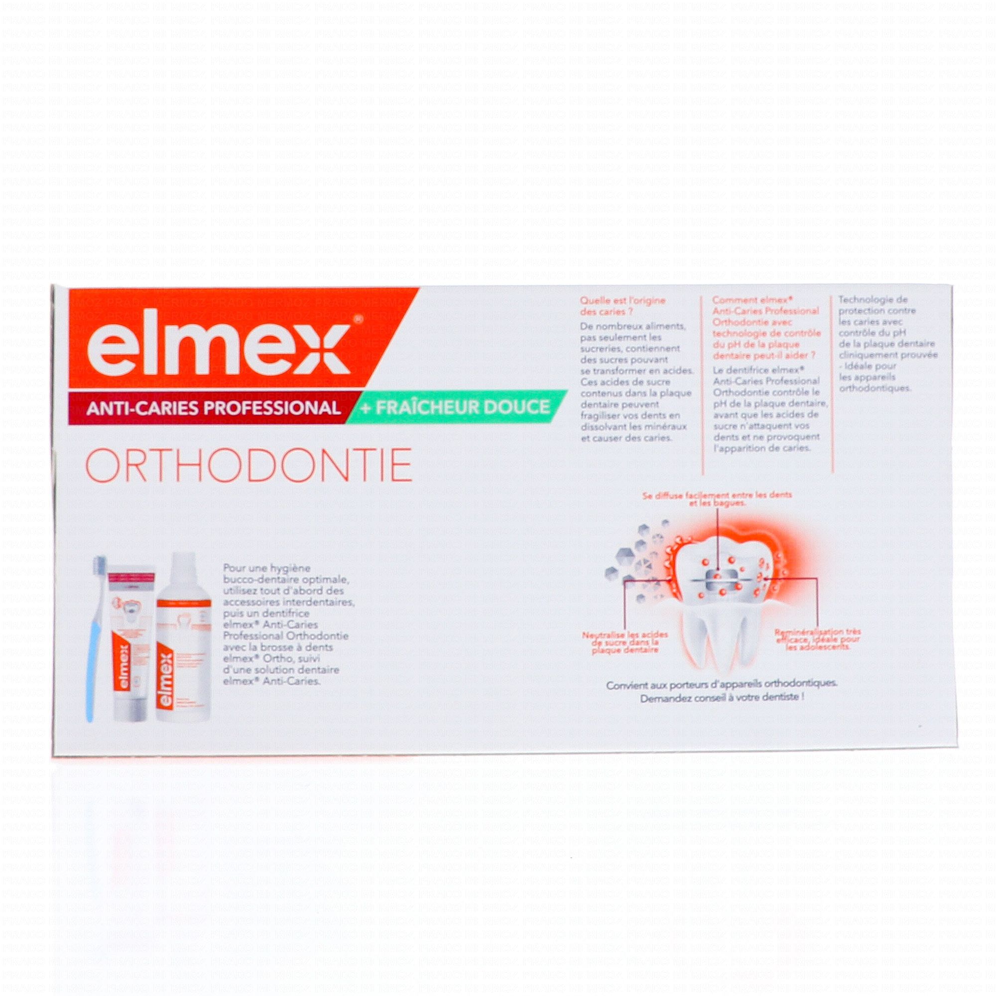 Le dentifrice Elmex Anticaries Professional +Ortho intègre la technologie "Neutraliseur d'acides de sucre". Elle permet de combattre les composés qui sont à l'origine des caries. Il va également fortifier les dents. Il se diffuse parfaitement entre les dents et les bagues.