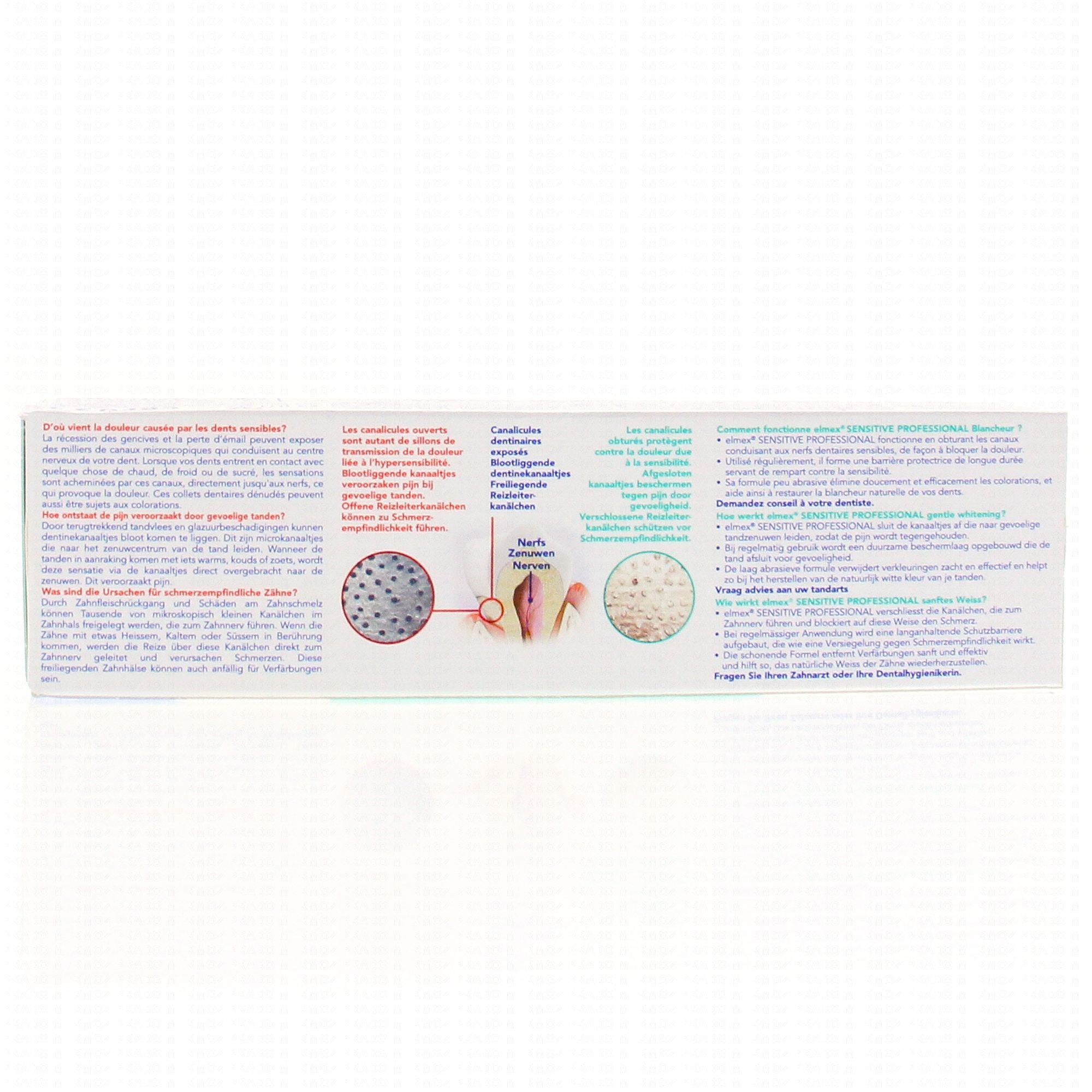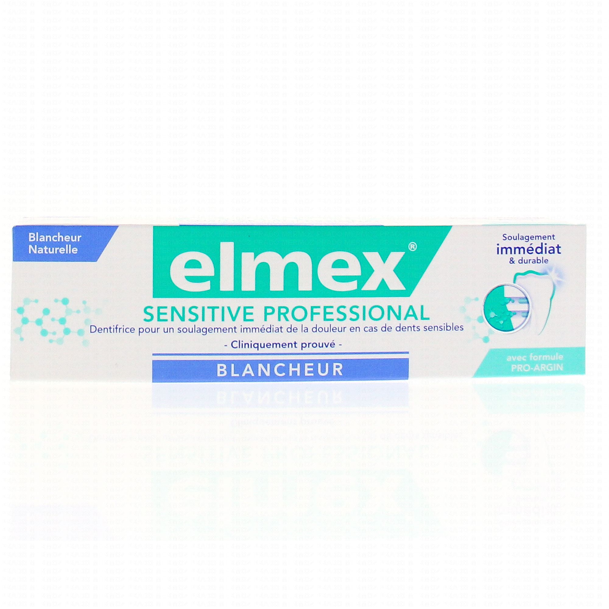 Le dentifrice Elmex sensitive pro Blancheur obture les canaux conduisant aux nerfs dentaires sensibles, de façon à bloquer la douleur. Utilisé régulièrement, il forme une barrière protectrice de longue durée servant de rempart contre la sensibilité. La douleur est immédiatement soulagée, et de manière durable. Soin protecteur, soulage immédiatement et durablement la sensibilité dentaire. Restaure la blancheur naturelle des dents. Conditionnement : tube, étui carton.