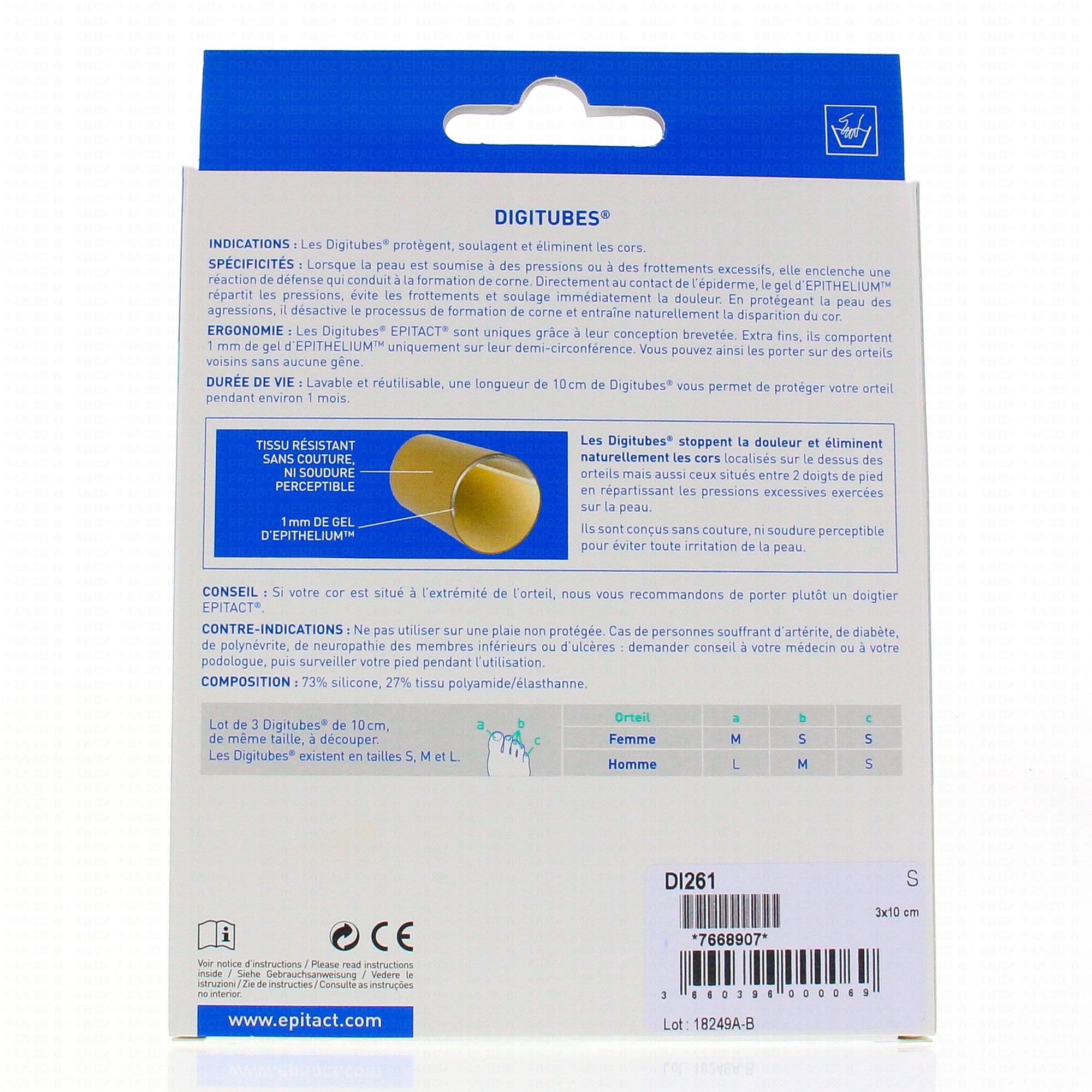 La demi-circonférence des Digitubes soulage les pressions et prévient la formation de cors dorsaux et oeils-de-perdrix. L'épithélium 26 est une gel de silicone breveté par des podologues : répartit les pressions et diminue les frottements. A porter sur des orteils voisins sans aucune gêne.
