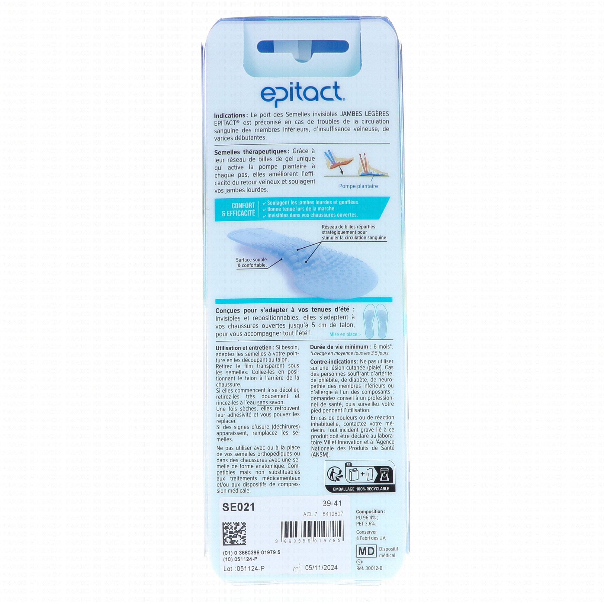 Les semelles EPITACT Jambes Légères sont conçues pour soulager les sensations de jambes lourdes et améliorer la circulation sanguine. Leur conception anatomique et leur gel souple offrent un effet massant à chaque pas, stimulant ainsi le retour veineux. Invisibles et discrètes, elles s'adaptent à toutes les chaussures fermées et garantissent un confort optimal tout au long de la journée. Les semelles sont lavables et réutilisables, assurant une hygiène parfaite et une longue durée d'utilisation. Elles sont idéales pour les personnes souffrant d'insuffisance veineuse, de varices débutantes ou simplement de sensations de jambes fatiguées.