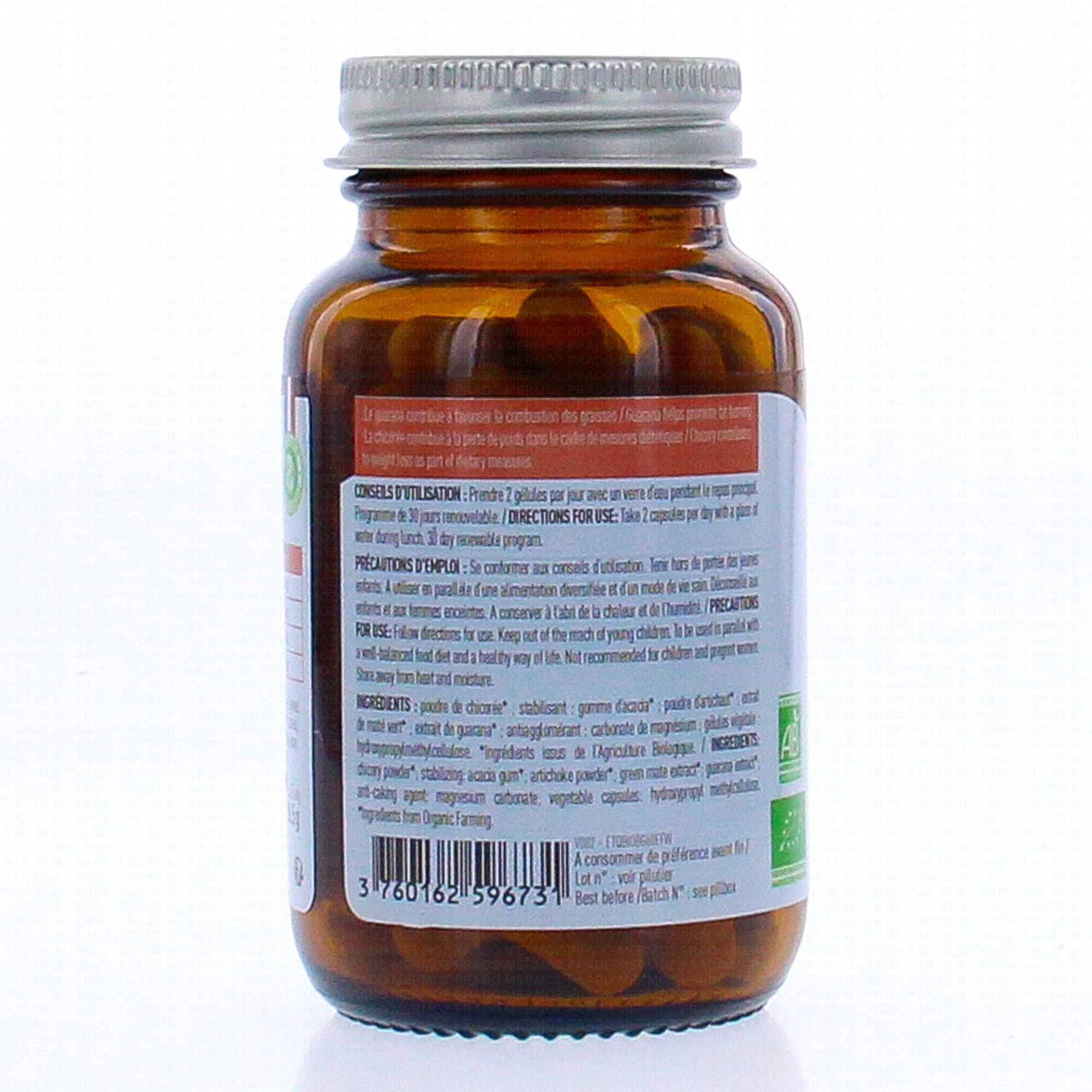 Poudre de chicorée* ; stabilisant : gomme d'acacia* ; poudre d'artichaut*; extrait de mate vert* ; extrait de guarana* ; antiagglomérant : carbonate de magnésium ; gélules végétale : hydroxypropylmethylcellulose. *