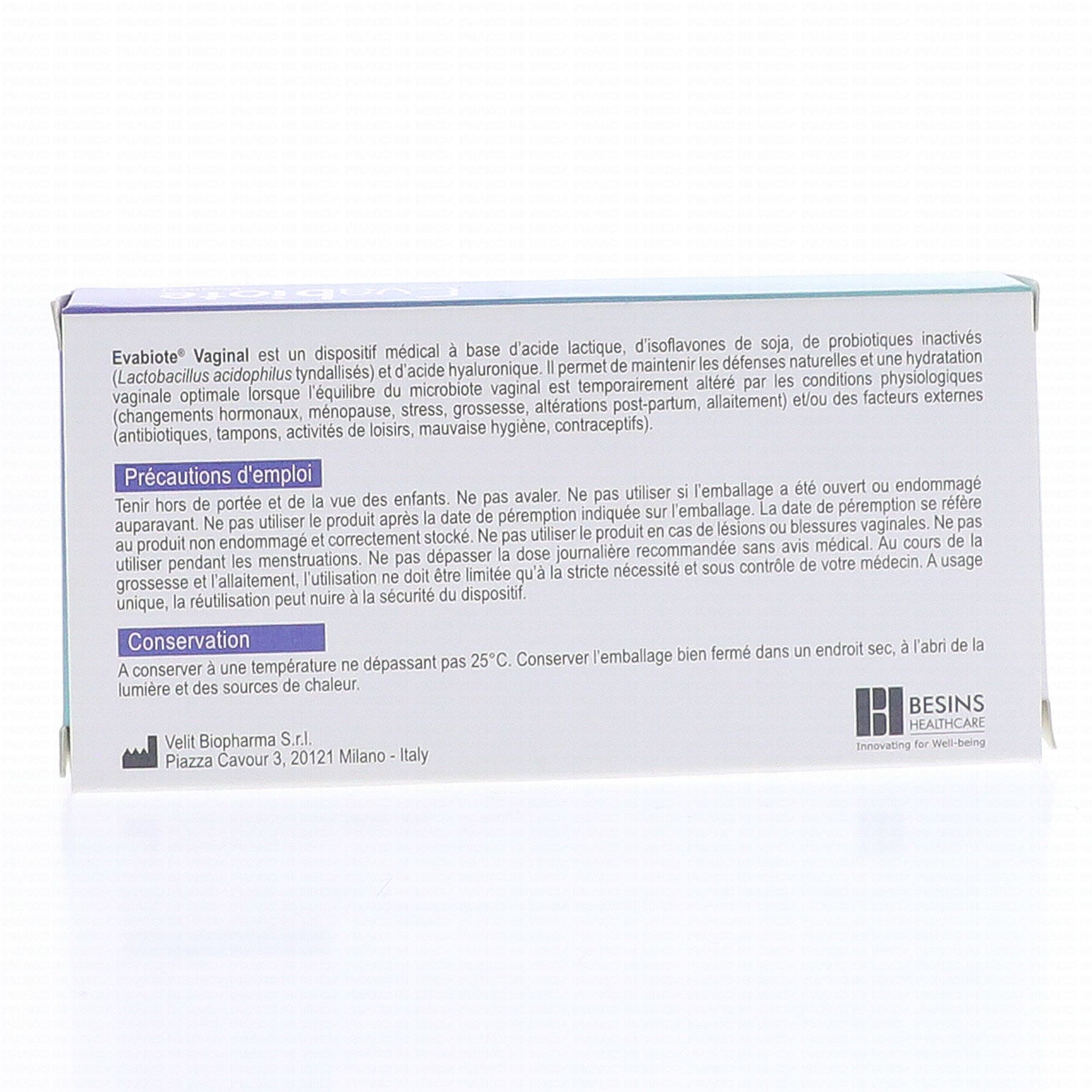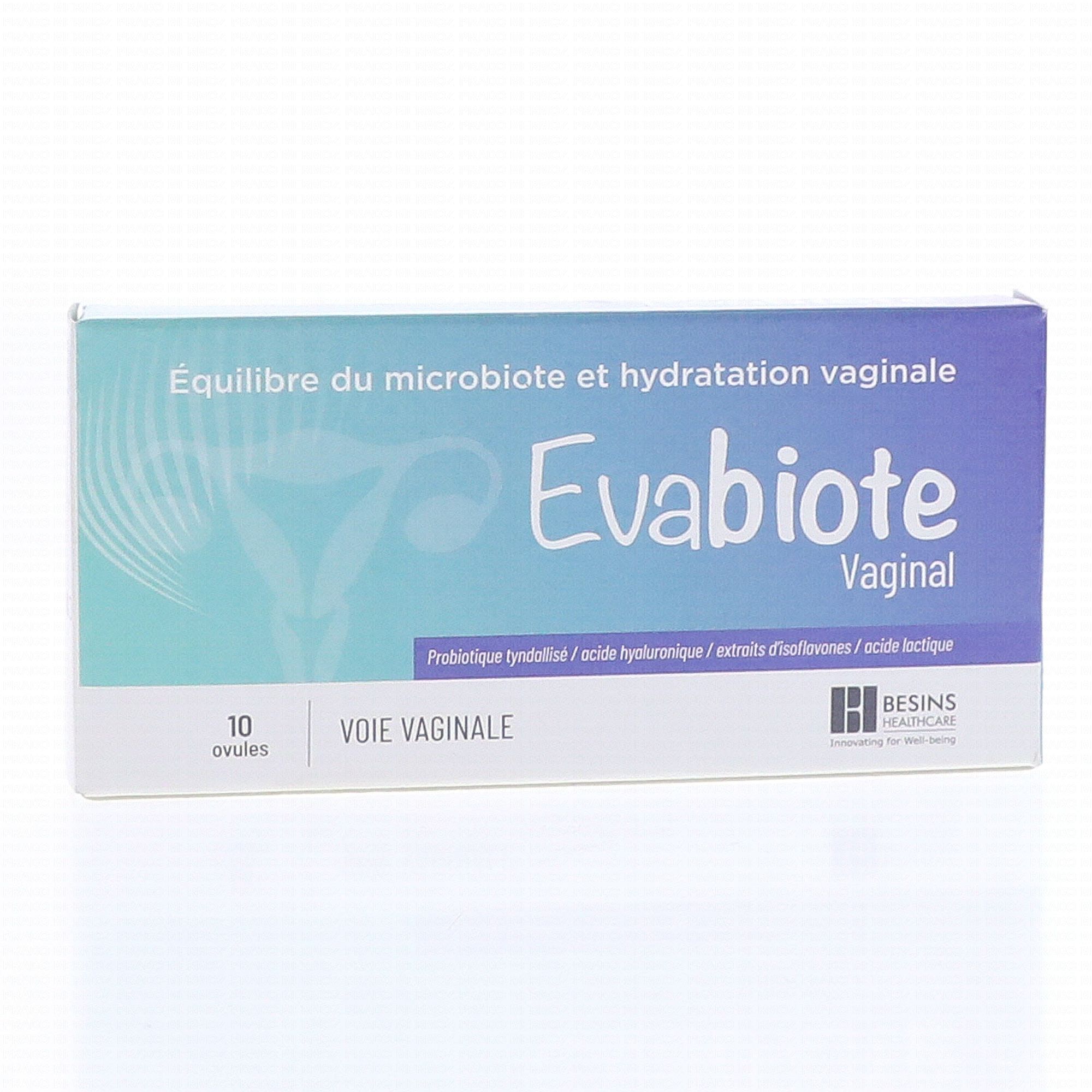 Evabiote Vaginal est un dispositif médical. Il se présente sous forme d'ovule à utiliser par voie vaginale et contient différents actifs, dont un postbiotique destiné à maintenir l'équilibre du microbiote vaginal et l'hydratation vaginale.
