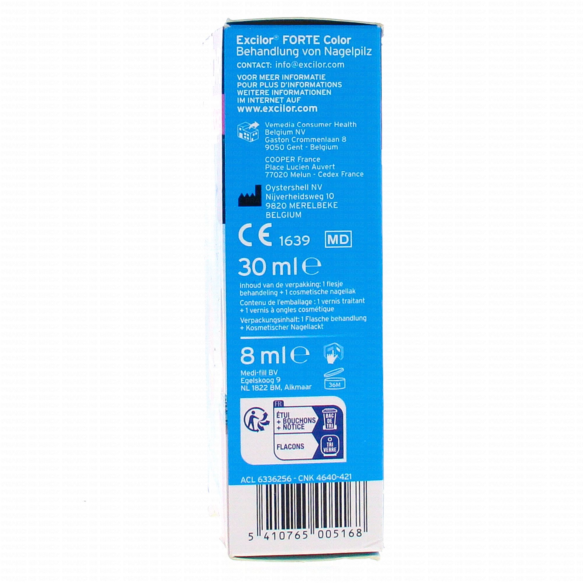 Excilor® FORTE Color ne doit pas être utilisé sur des ongles sains. Un vernis à ongles classique (cosmétique) de la même couleur est disponible. Le film formé sur l' ongle est résistant à l' eau et à des contraintes physiques telles que le frottement. Cependant, au niveau de la partie haute de l'ongle, de petites parties du film peuvent se détacher/ libérer. Cela n' affectera pas l' efficacité du produit. Une couche de vernis à ongles peut être appliquée sur le film transparent une fois sec. Après 24 heures, retirer le film. Décoller le film par un angle puis rouler le film doucement jusqu' à libérer l' ongle complètement. L' eau chaude peut faciliter le décollement. Appliquer de nouveau le produit, comme indiqué ci-dessus. Bien se laver les mains après chaque retrait et nouvelle application. Pour de meilleurs résultats, traiter l' ongle pendant un minimum de trois mois et continuer le traitement jusqu' au rétablissement complet de l' ongle. S' assurer que la bouteille est bien fermée après chaque utilisation pour éviter l' évaporation du produit. Un surplus de film peut se former sur le rebord du flacon..