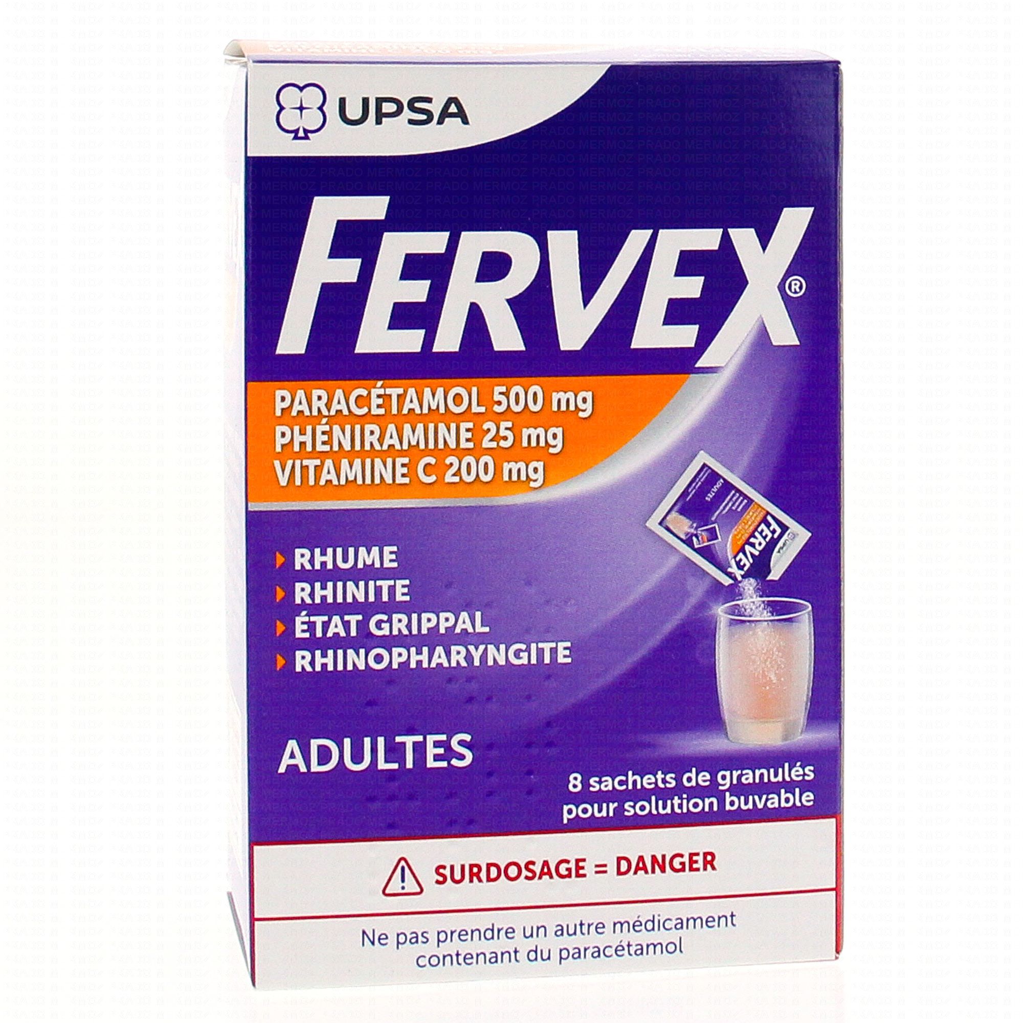 FERVEX ADULTES, granulés pour solution buvable en sachet est indiqué chez les adultes et l'enfant (à partir de 15 ans) dans le traitement au cours des rhumes, rhinites, rhinopharyngites et des états grippaux: