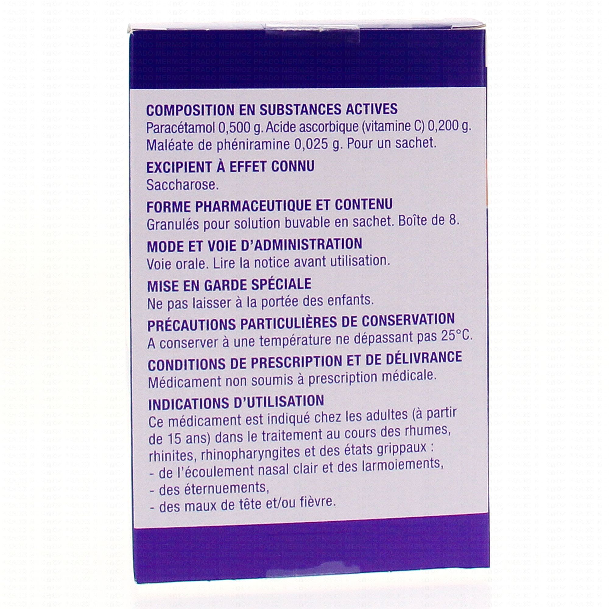 Ce médicament est indiqué chez les adultes (à partir de 15 ans) dans le traitement au cours des rhumes, rhinites, rhinopharyngites et des états grippaux :
