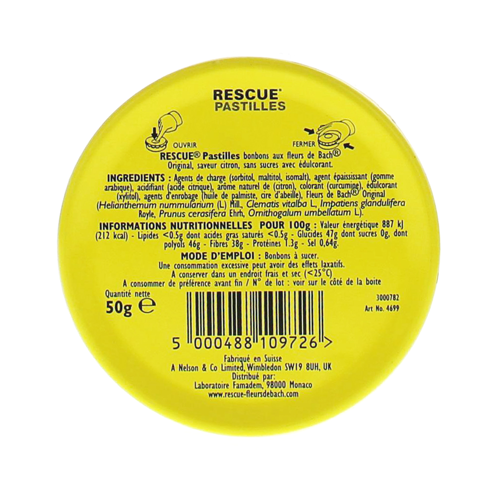 Agents de charge (sorbitol, maltitol, isomalt), agent épaississant (gomme arabique), acidifiant ( acide citrique), arôme naturel de citron, colorant curcumine), édulcorant ( xylitol), agents d'enrobage (huile de palmiste, cire d'abeille), fleurs de bach original ( helianthemum nummularium L., mill, clematis vitalba L., impatiens glandulifera, royle, prunus cerasifera ehrh, ornithogalum umbellatum L.)