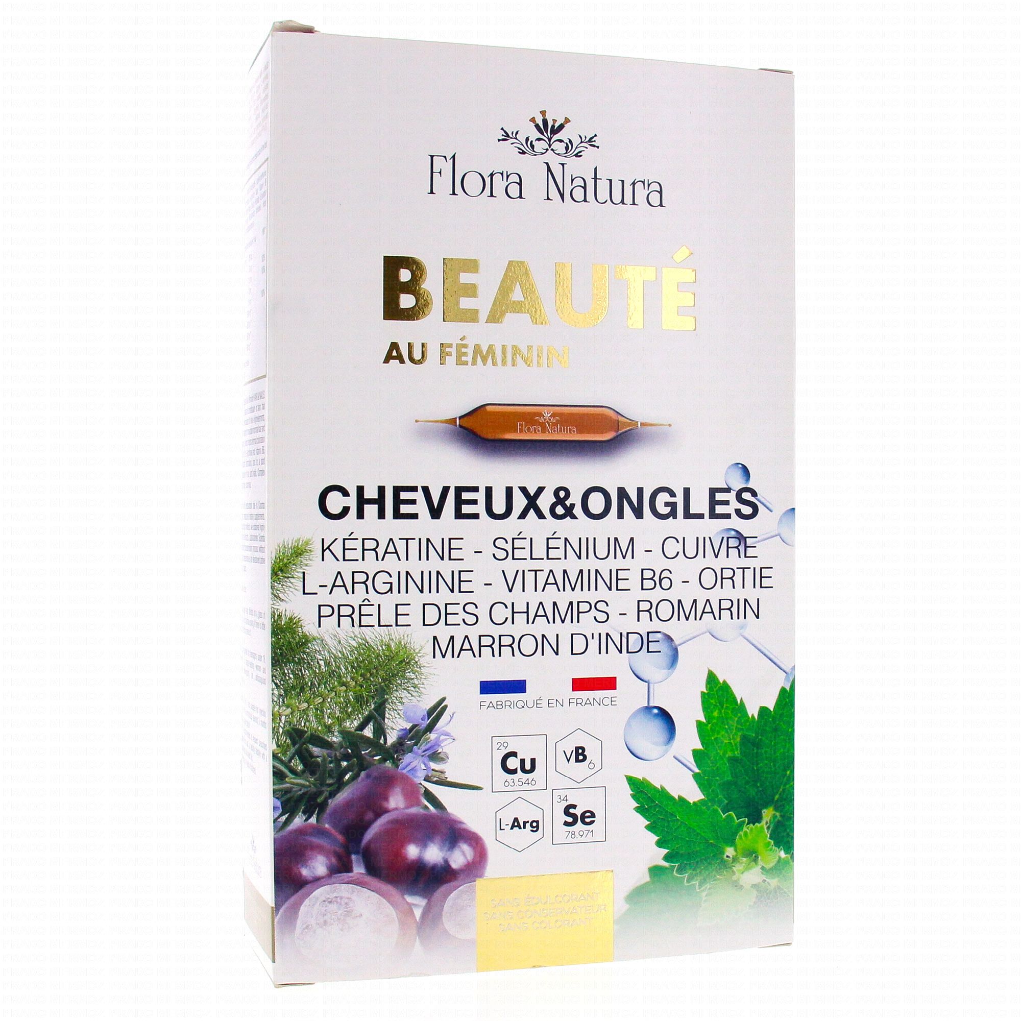 FLORA NATURA Beauté au féminin cheveux et ongles 20 ampoules est un complément alimentaire qui contribue à la santé de la peau et des ongles grâce à la présence de Prêle. L'Ortie joue un rôle dans le maintien de la santé de la peau. Le Romarin participe au maintien des fonctions physiologiques purificatrices. Le Cuivre favorise la pigmentation normale des cheveux. Le Sélénium aide à protéger les cellules du stress oxydatif. Le Marronier d'inde soutient d'activité physiologique des phanères.
