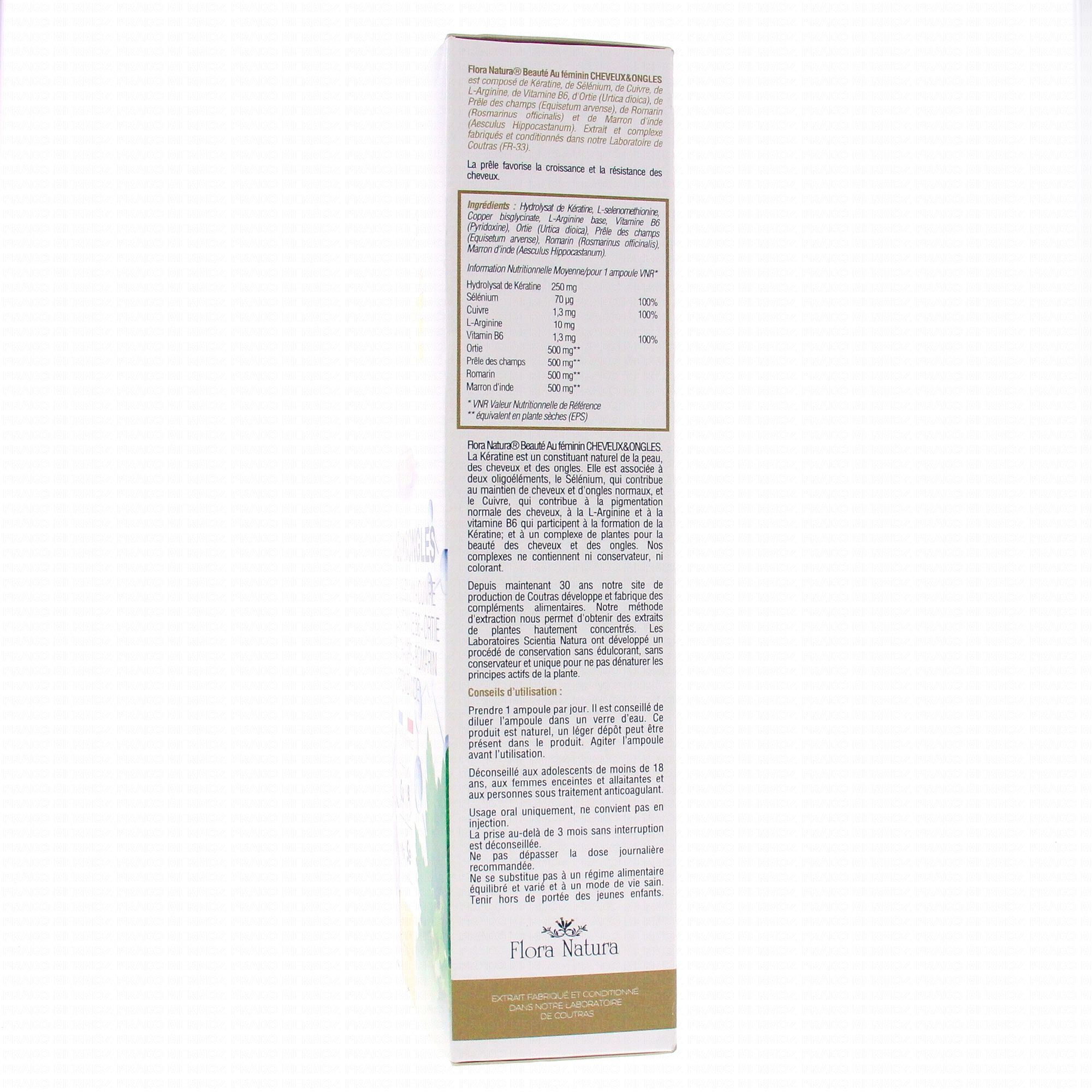FLORA NATURA Beauté au féminin cheveux et ongles 20 ampoules contient les éléments suivants :